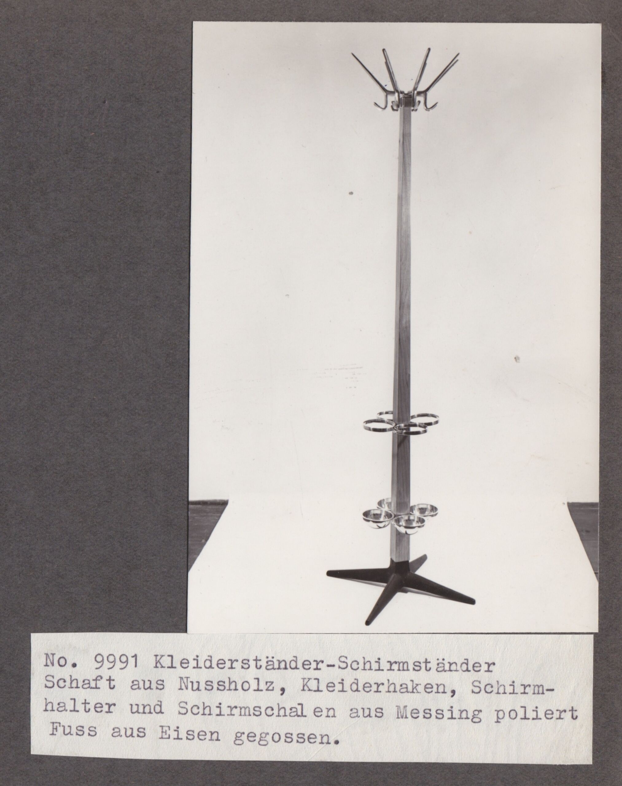 - Text: No. 9991 Kleiderständer-Schirmständer/Schaft aus Nussholz, Kleiderhaken, Schirm-/halter und Schirmschalen aus Messing poliert/Fuss aus Eisen gegossen.