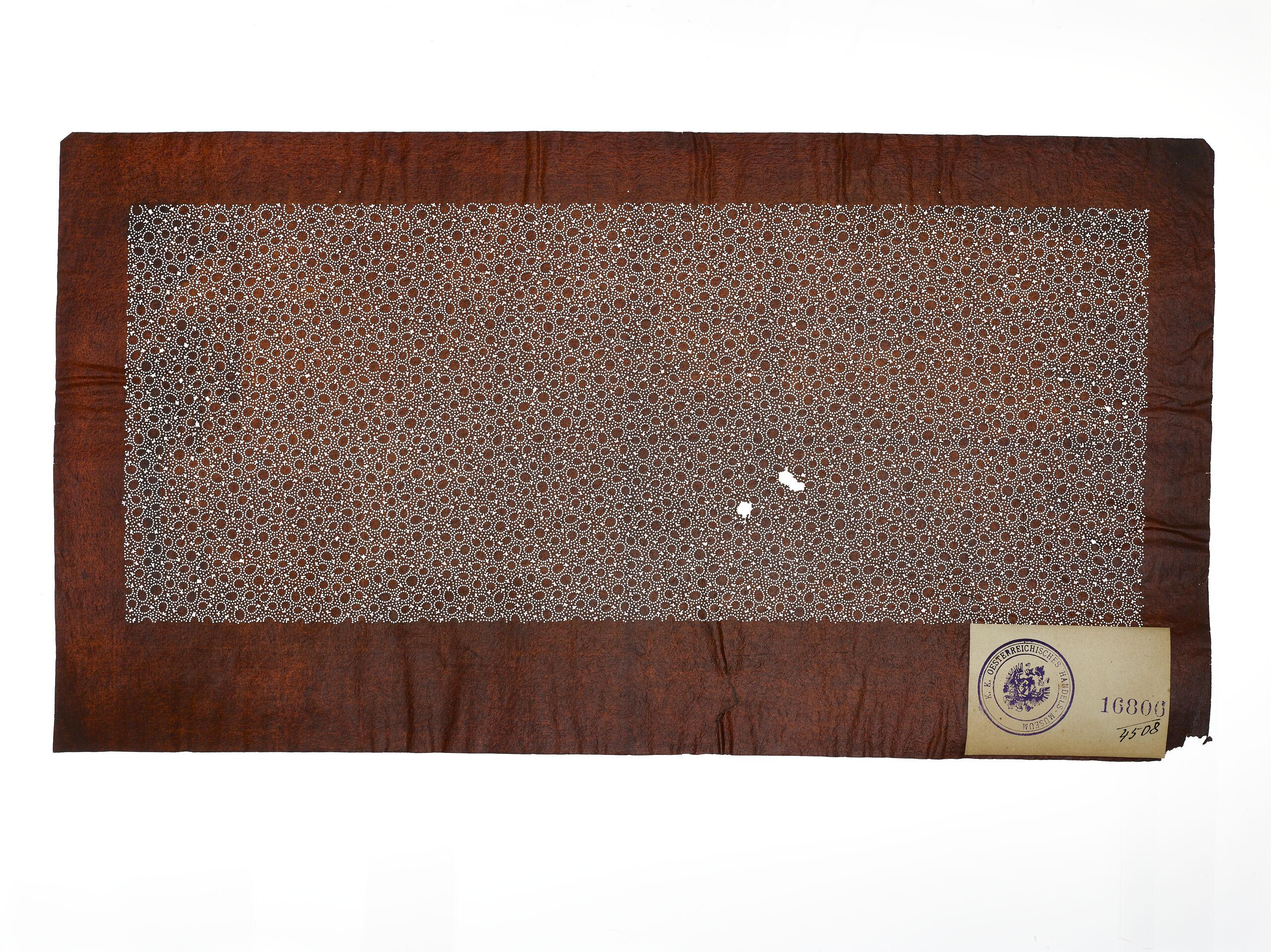 • Färbeschablone (Katagami 型紙), Komon 小紋, Pflanzenmuster (shokubutsu monyō 植物文様), Flächenmuster (waritsuke monyō 割付文様): arare あられ (Hagelkörner; Punkte) und Auberginen(?), Anonym, MAK Inv.nr. OR 3925-4508