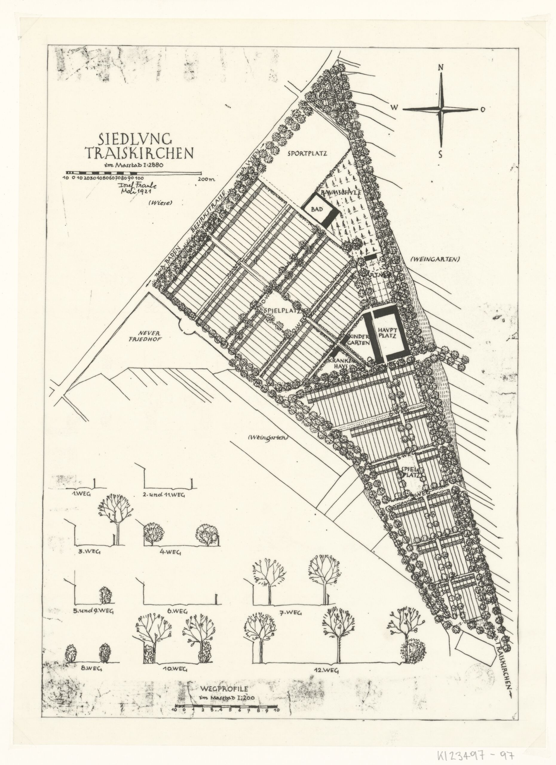 - Kopie des Entwurfs für die Siedlung Traiskirchen, Fassung 1. Lageplan und Wegprofile (Skizzen) (vom Bearbeiter vergebener Titel)