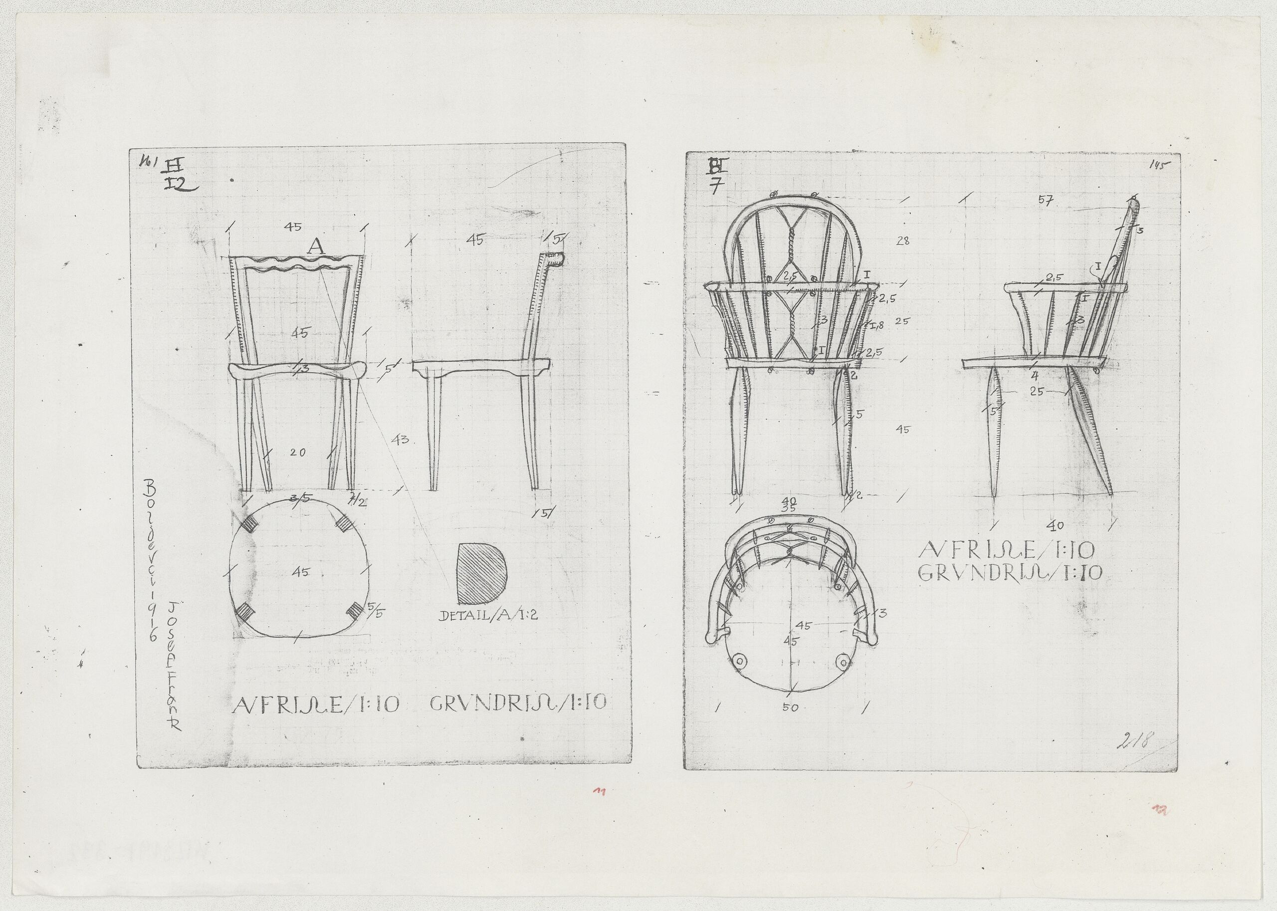 Möbelentwurf, Kopie des Entwurfs für zwei Stühle, einer mit runder Sitzfläche und gebogener Rückenlehne mit vertikalen Sprossen und einem Stuhl mit runder Sitzfläche, Josef Frank, MAK Inv.nr. KI 23497-332