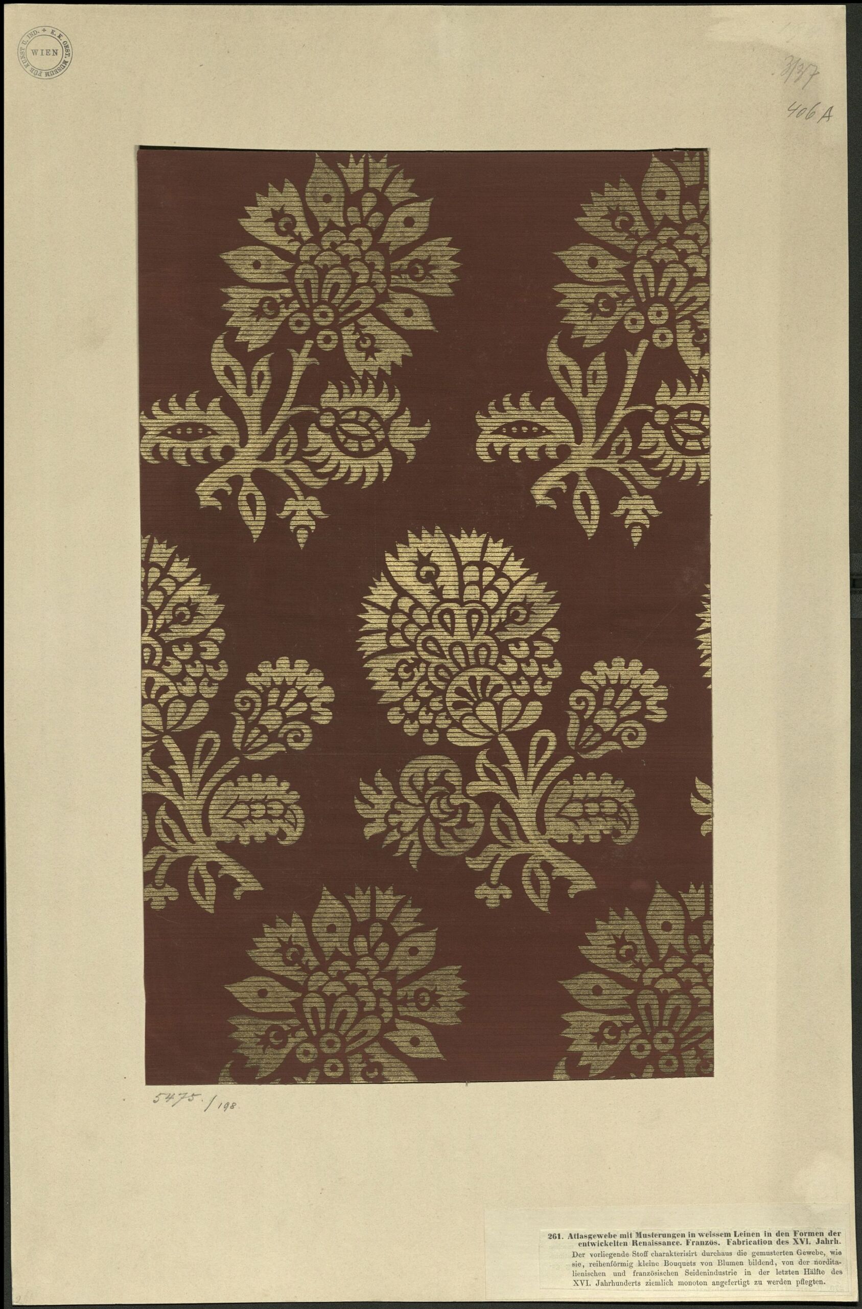 - Aufkleber (rechts unten) : 261. Atlasgewebe mit Musterungen in weissem Leinen in den Formen der / entwickelten Renaissance. Französ. Fabrication des XVI. Jahrh. / Der vorliegende Stoff charakterisirt durchaus die gemusterten Gewebe [...].