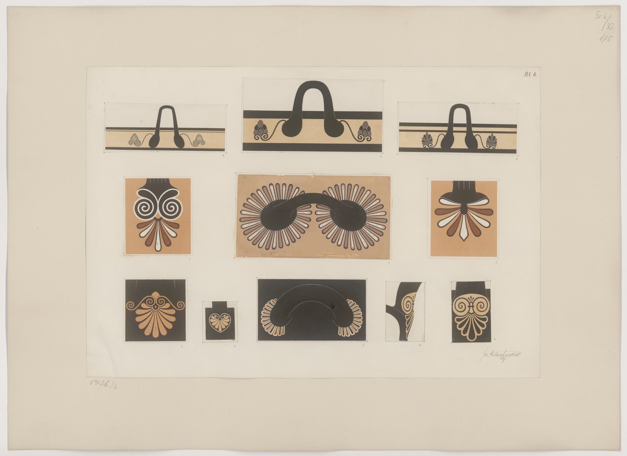 Stilkopie, Kopie eines Ornaments aus einem stilisierten Palmblatt in einer Herzform auf einem antiken Tongefäß von Rudolf Feldscharek, Rudolf Feldscharek, MAK Inv.nr. KI 5426-6-8