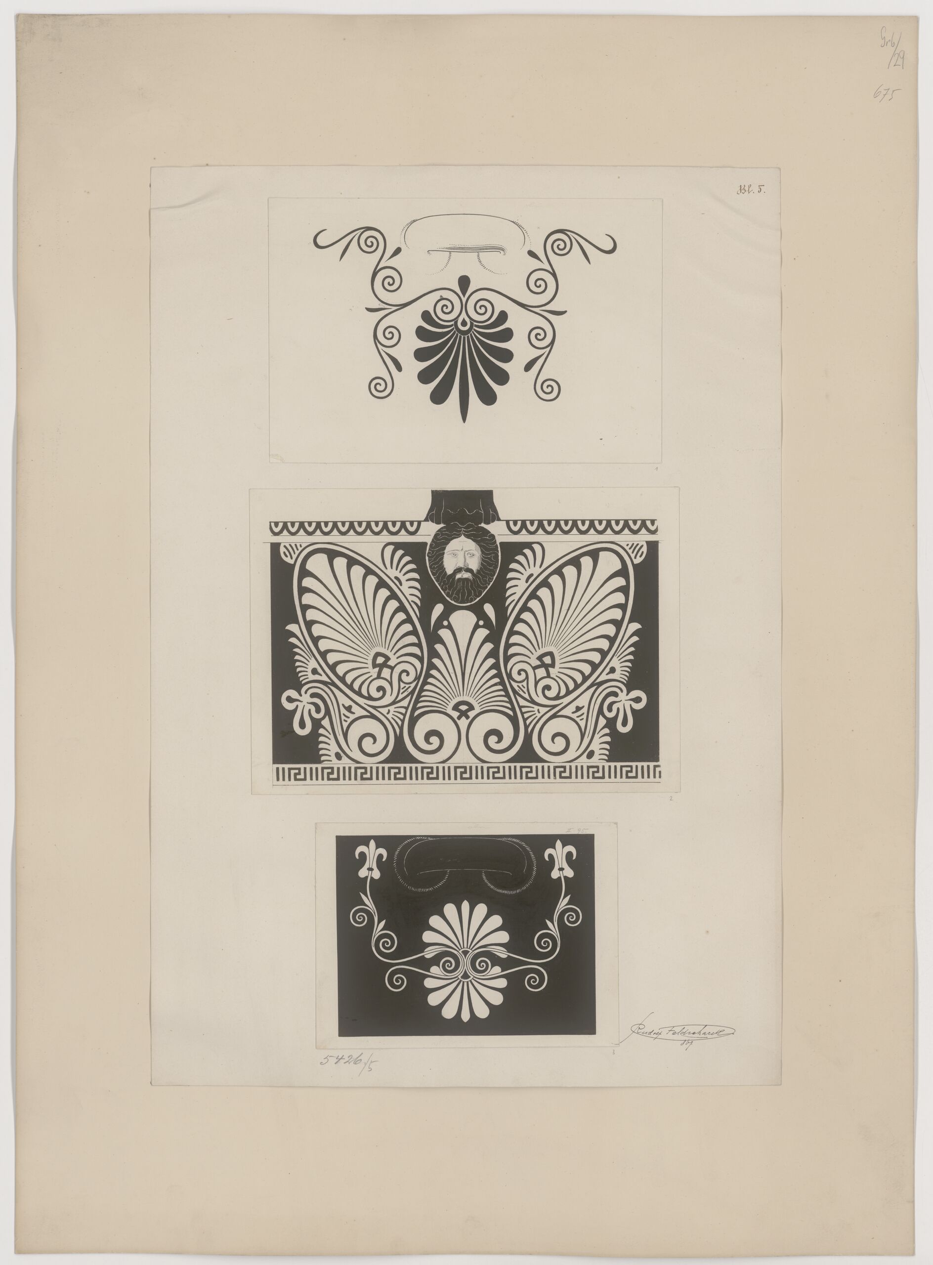 Stilkopie, Kopie eines Ornaments aus stilisierten Palmblättern und männlicher Maske auf einem antiken Tongefäß von Rudolf Feldscharek, Rudolf Feldscharek, MAK Inv.nr. KI 5426-5-2