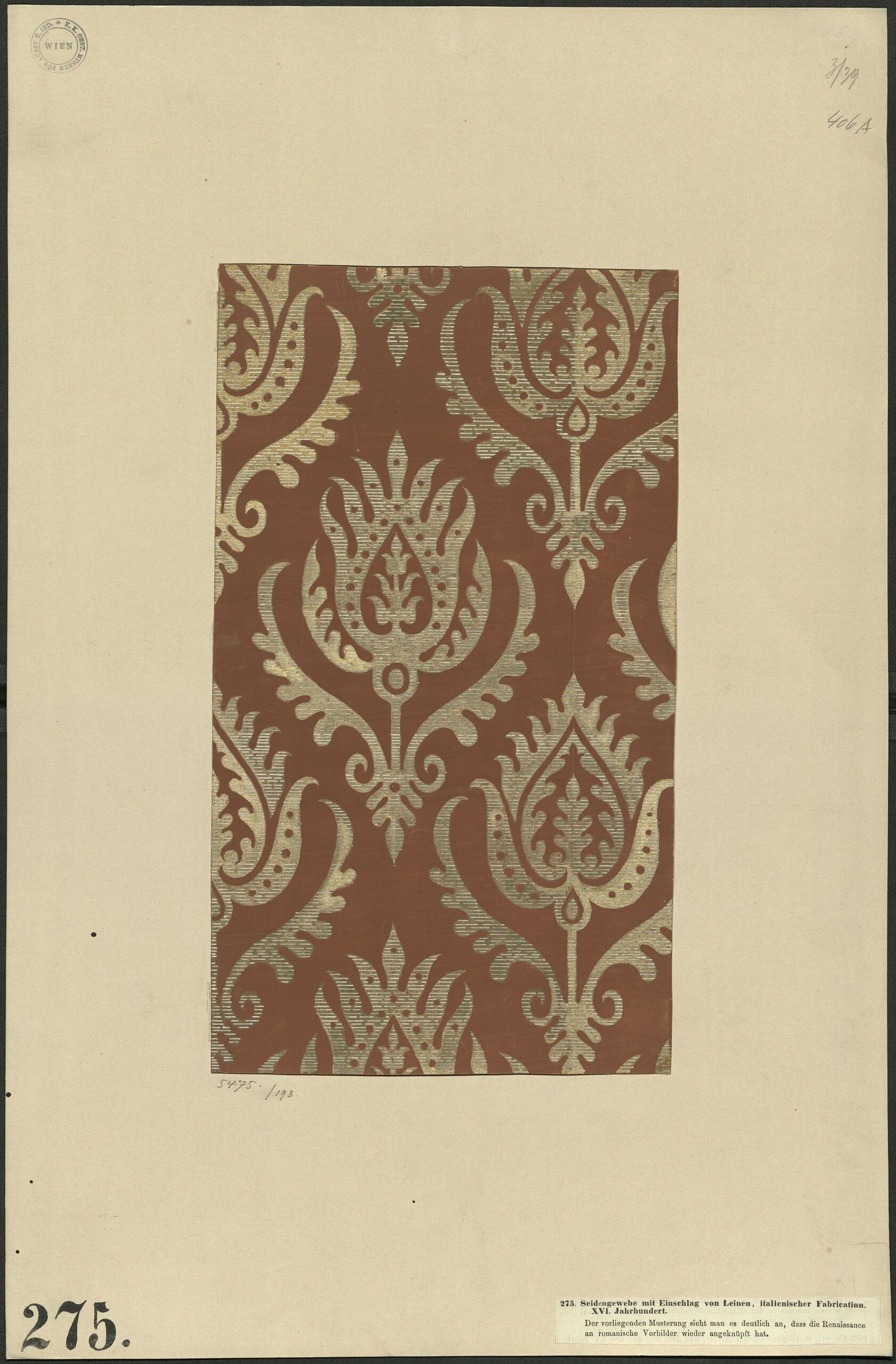- Aufkleber (rechts unten) : 275. Seidengewebe mit Einschlag von Leinen, italienischer Fabrication. / XVI. Jahrhundert. / Der vorliegenden Musterung sieht man es deutlich an, dass die Renaissance / an romanische Vorbilder wieder angeknüpft hat.