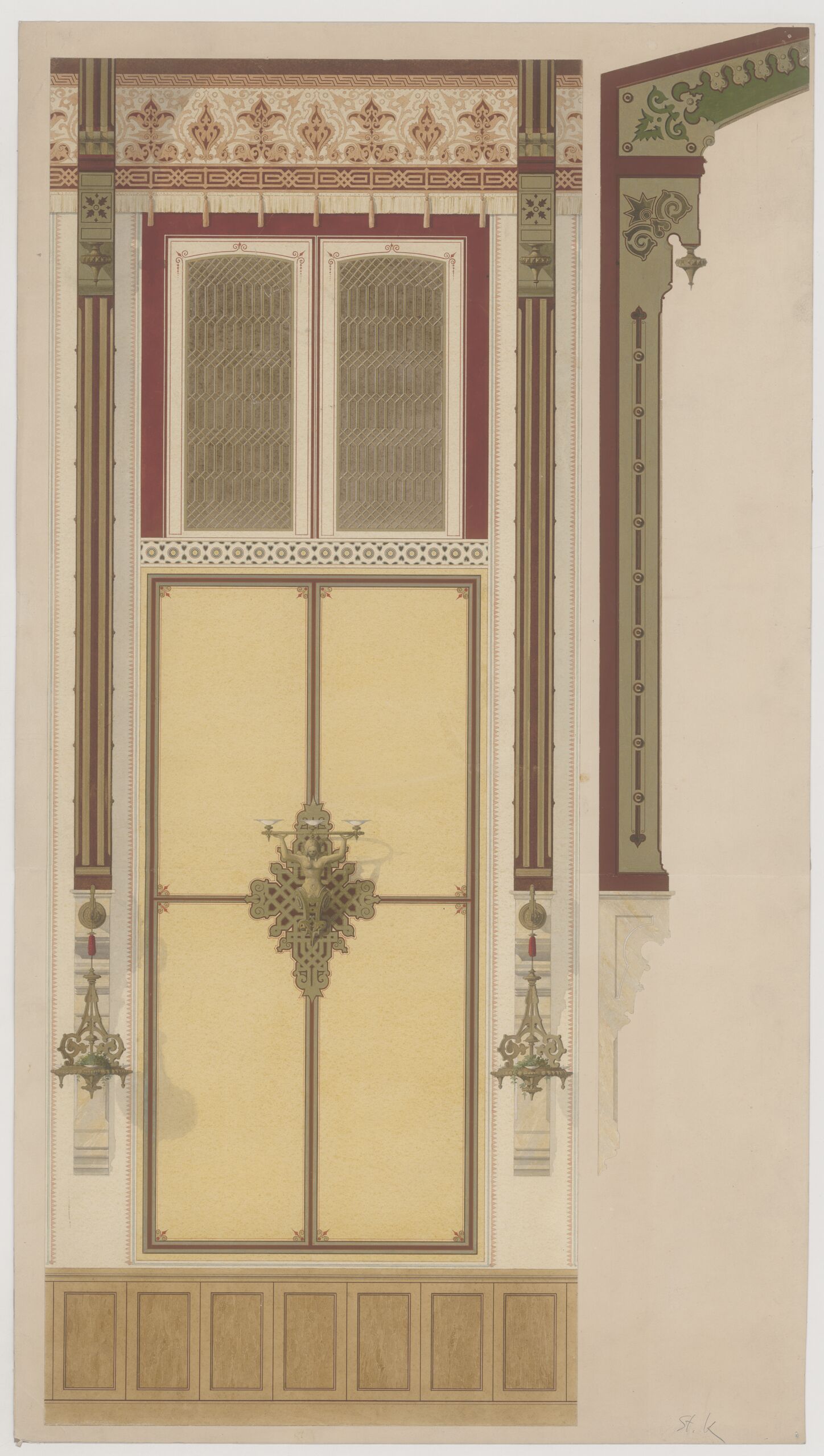 Stilkopie, Kopie von Vorder- und Seitenansicht einer Wanddekoration des 16. Jahrhunderts mit Paneelen, Kerzenleuchtern, Blindfenstern, Malerei und breiter Stoffleiste, Anonym, MAK Inv.nr. KI 23462-1