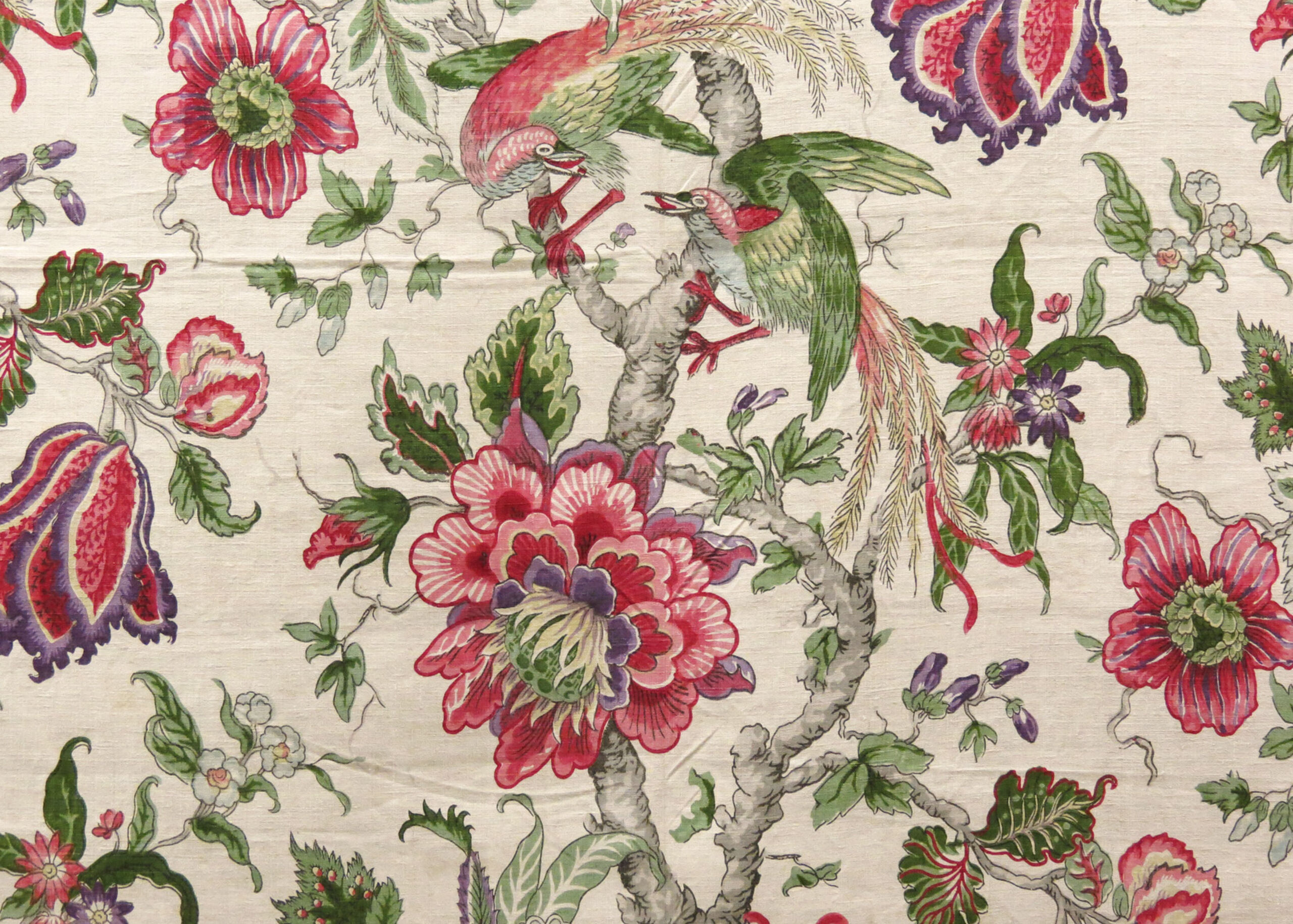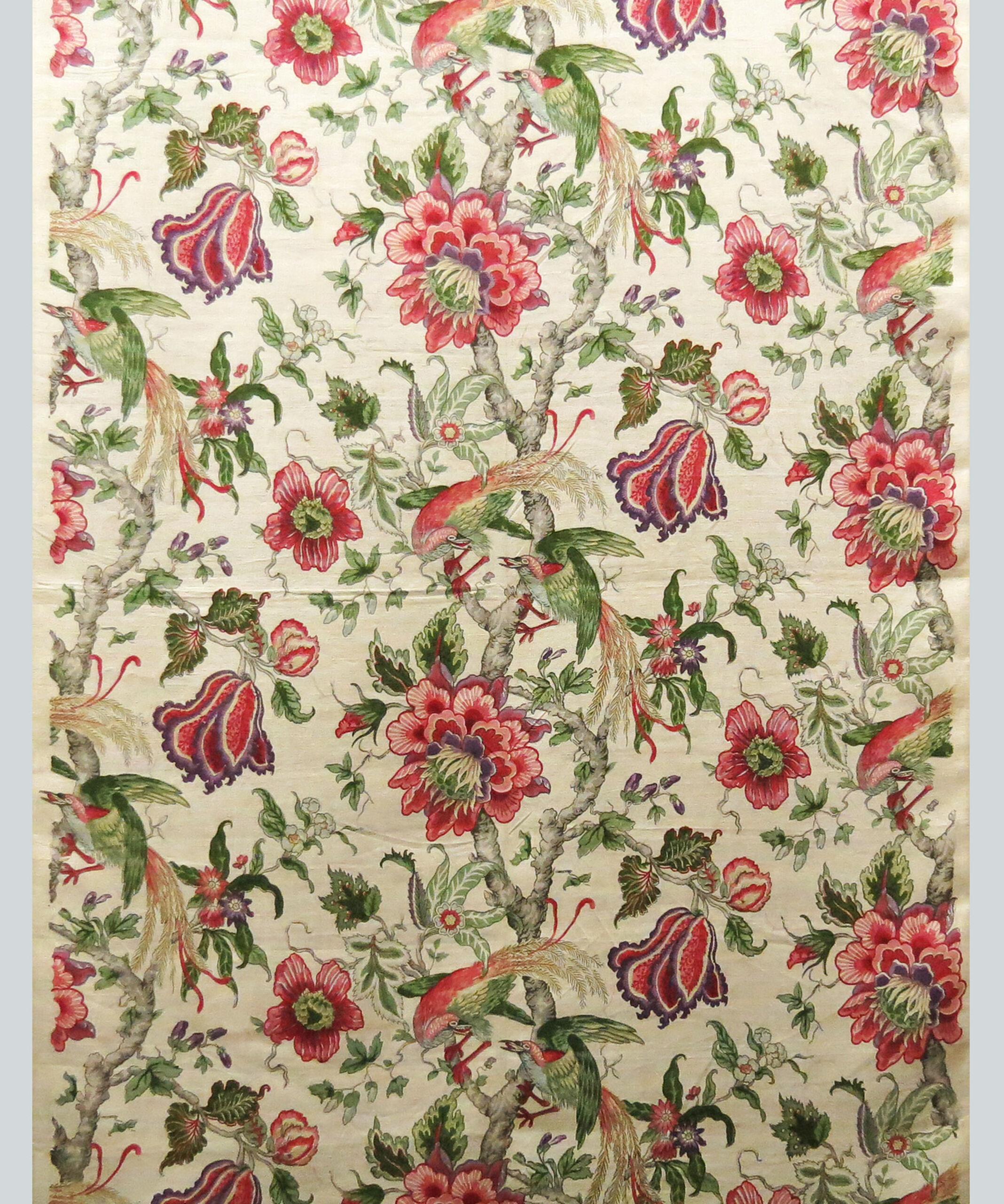 Dekorstoff, Kräftige Äste mit großen bunten Blüten und bunten Vögeln auf naturweißem Grund, Anonym, MAK Inv.nr. T 6664