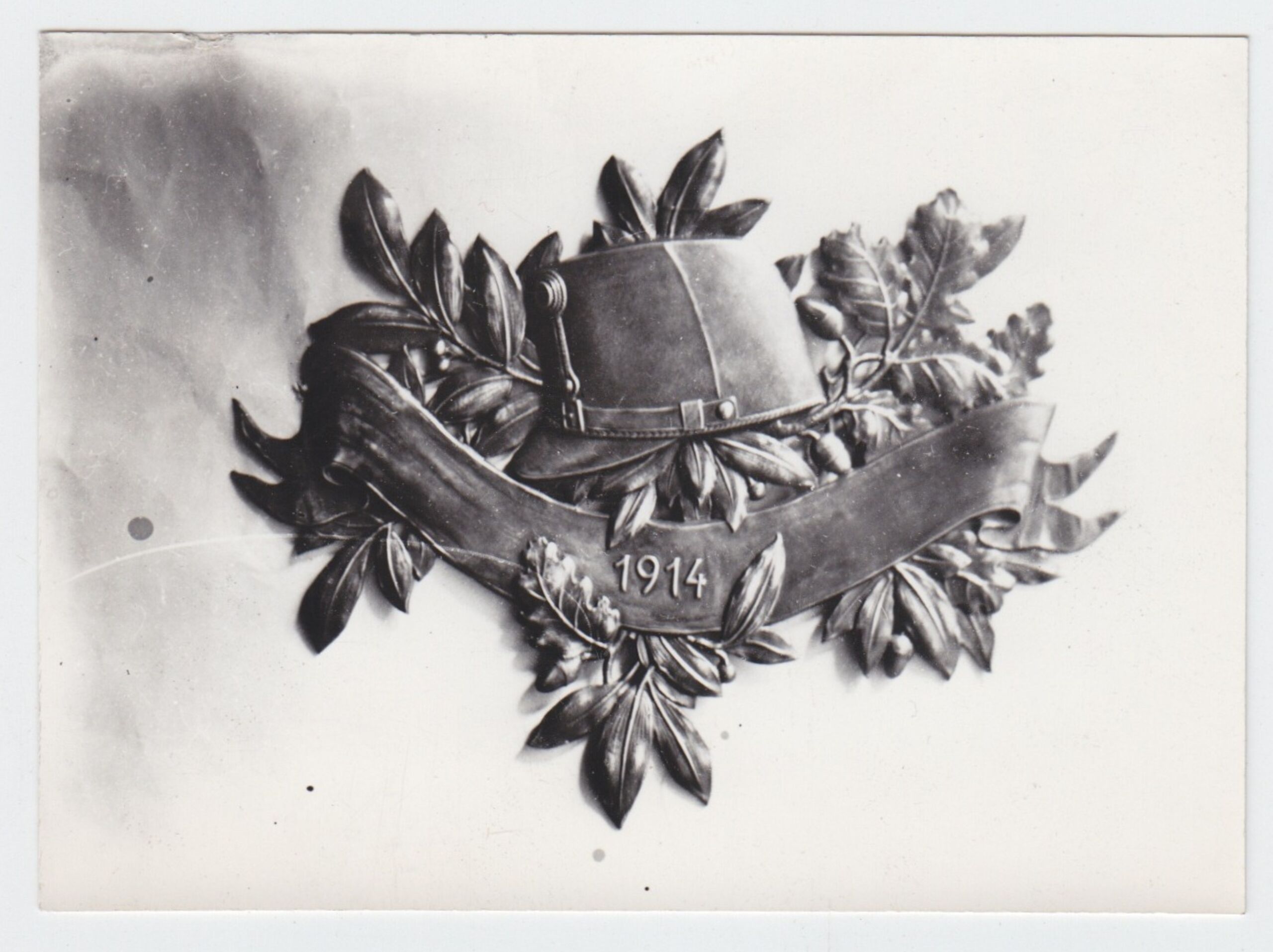 Fotografie, Kriegsabzeichen aus dem 1 . WK mit Offizierskappe für die Artillerie vor Lorbeer- und Eichenlaub, Schriftband mit Kriegsbeginn "1914", Werkstätte Hagenauer, MAK Inv.nr. HAF 2279