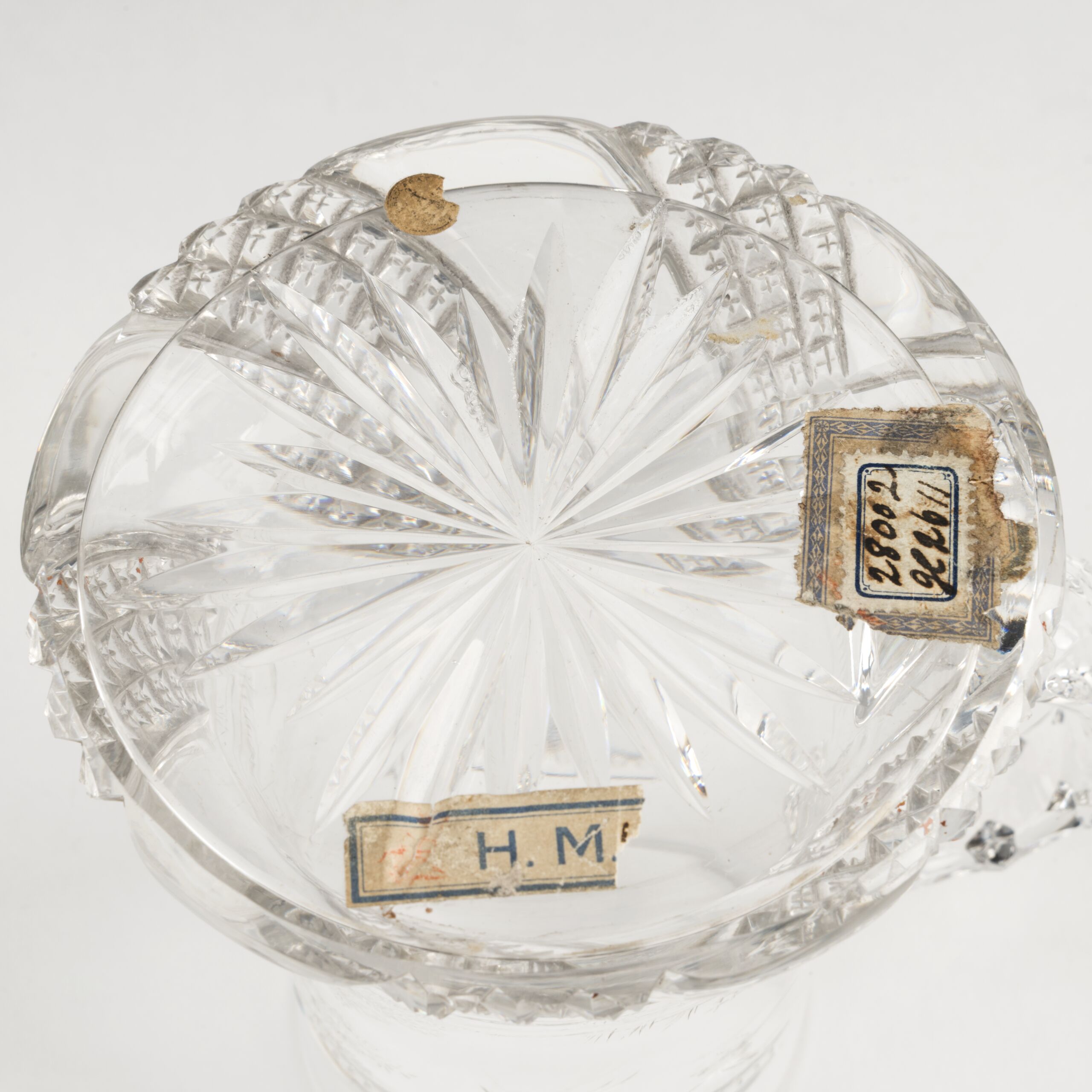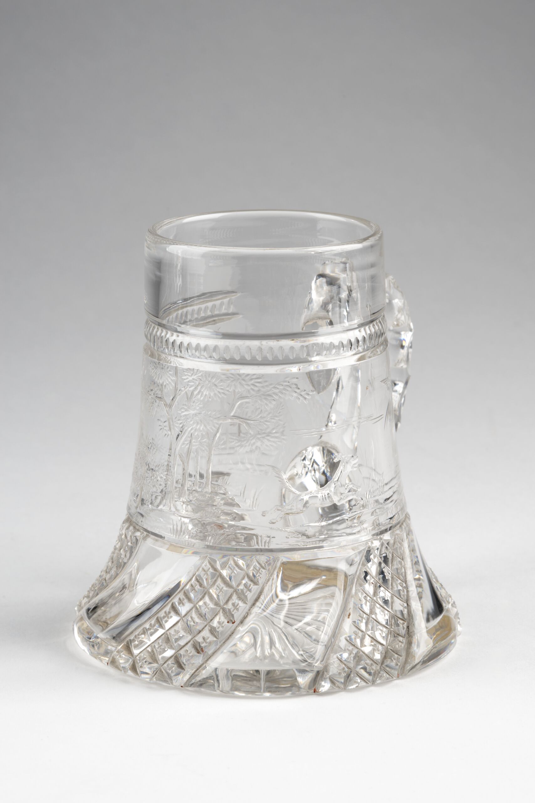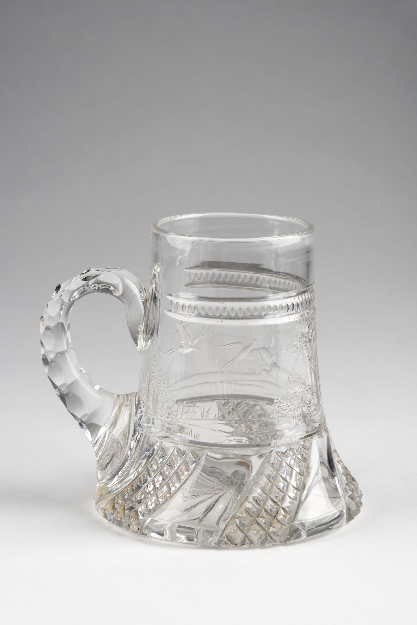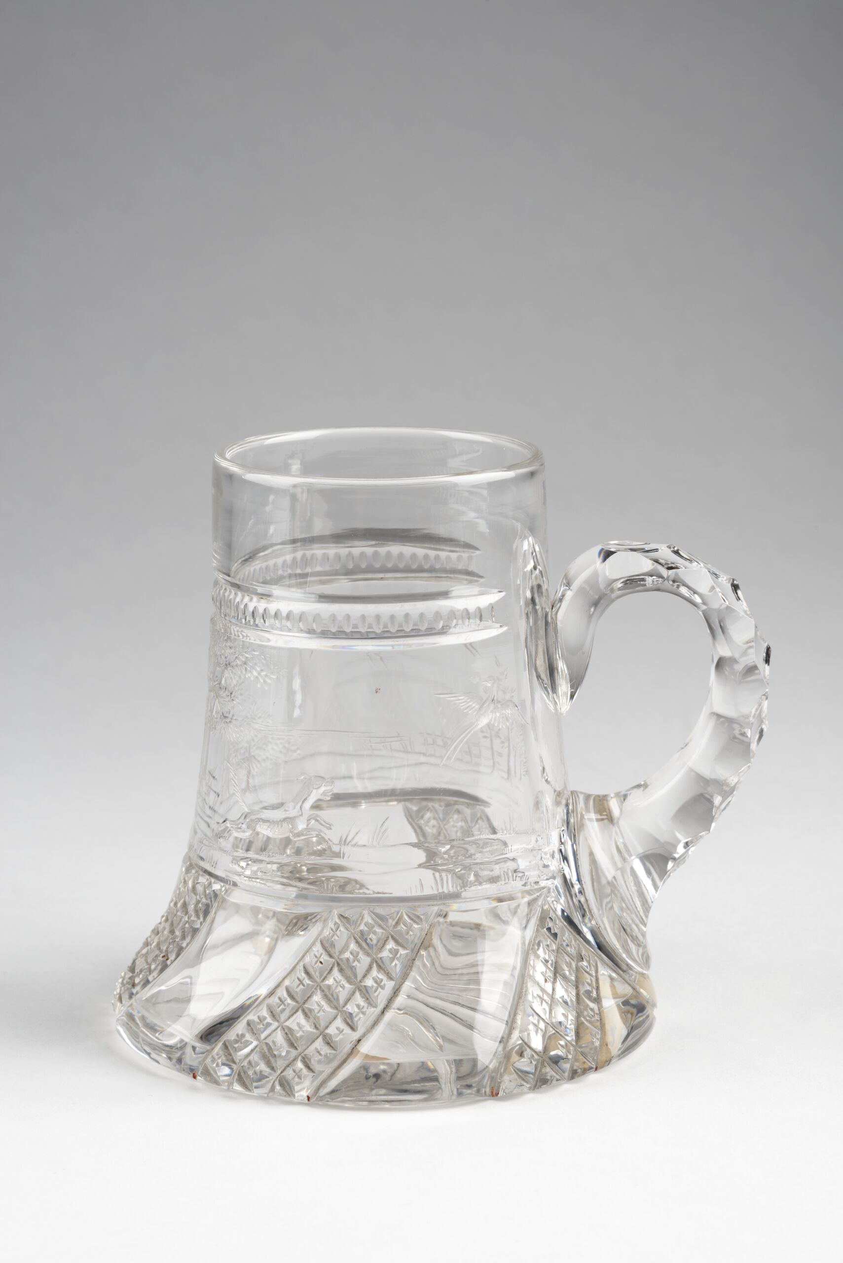 geschliffen und geschnitten. Nach unten ausladend alternierend gewalzt und brillantiert. Am Mittelteil in Blankschliff Hund und Fasanen in Landschaft. Facettierter Henkel. Bodenstern