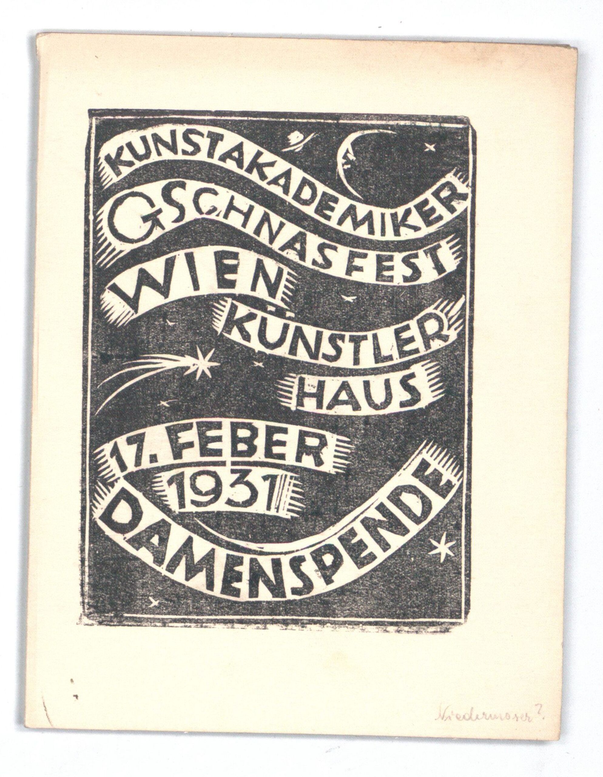 • Text am Objekt: KUNSTAKADEMIKER / GSCHNASFEST / WIEN / KÜNSTLER / HAUS / 17. FEBER / 1931 / DAMENSPENDE [gedruckter Text]