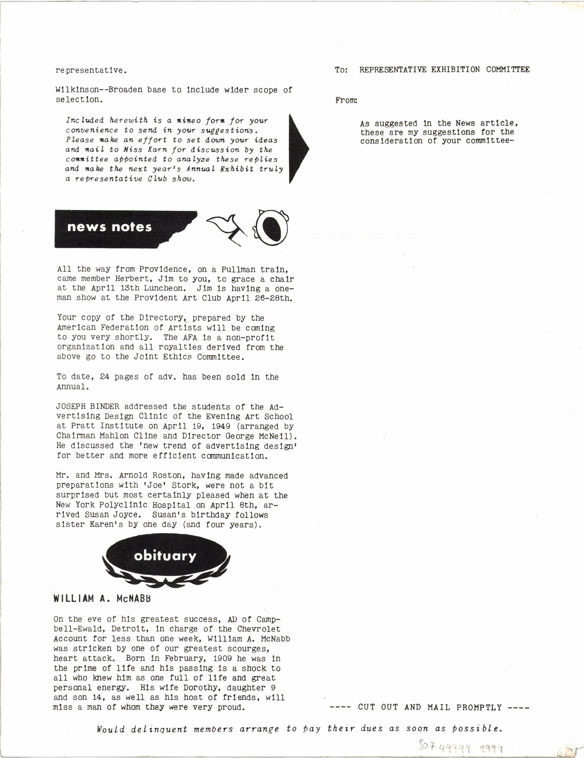 Zeitschriftenartikel, Kurzbericht über einen Vortrag Joseph Binders für die Studenten der "Advertising Design Clinic" am "Pratt Institute" am 19.04.1949, Anonym, MAK Inv.nr. KI 14145-907-225-1