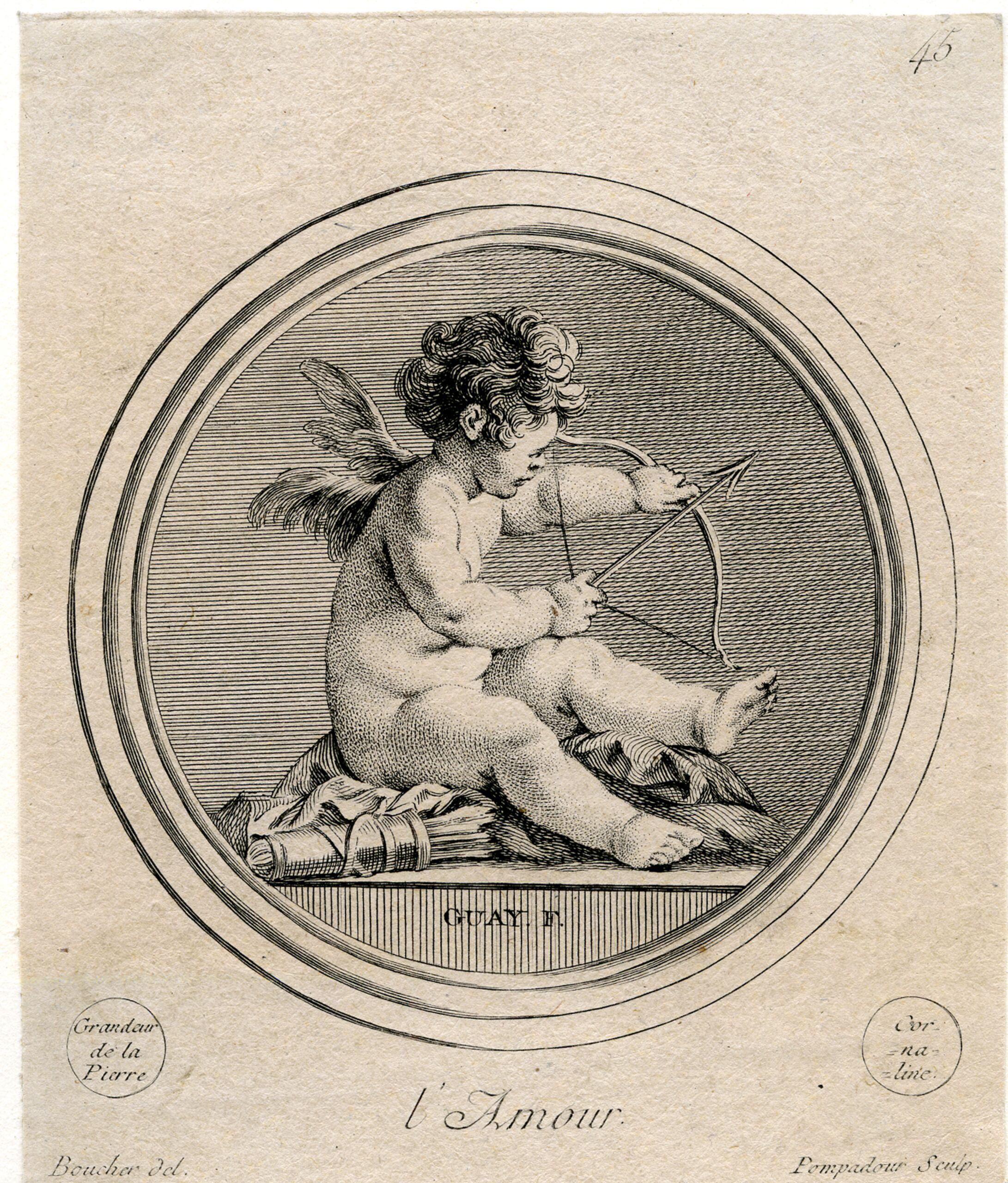 - Text am Objekt: GUAY F. / l‘ Amour. / Grandeur de la Pierre, Cornaline / Boucher del., Pompadur sculp. / 45
