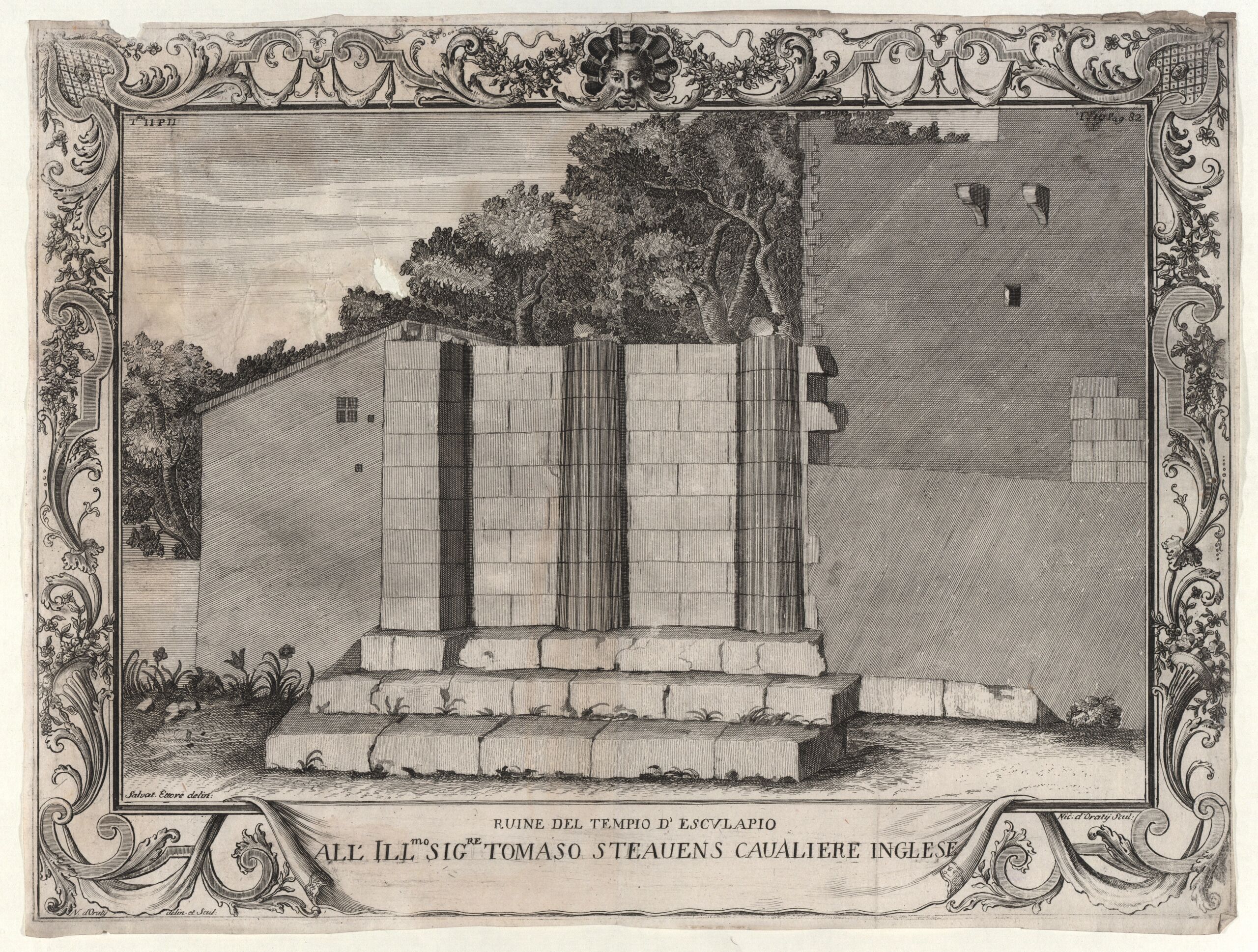 - Text am Objekt: Ruine del Tempio d’ Esculapio / All’ Ill. mo Sig. re Tomaso Steavens Cavaliere Inglese / Salvat. Ettore delin., Nic. d’ Oraty Scul. / N. d’ Oraty delin et scul.
