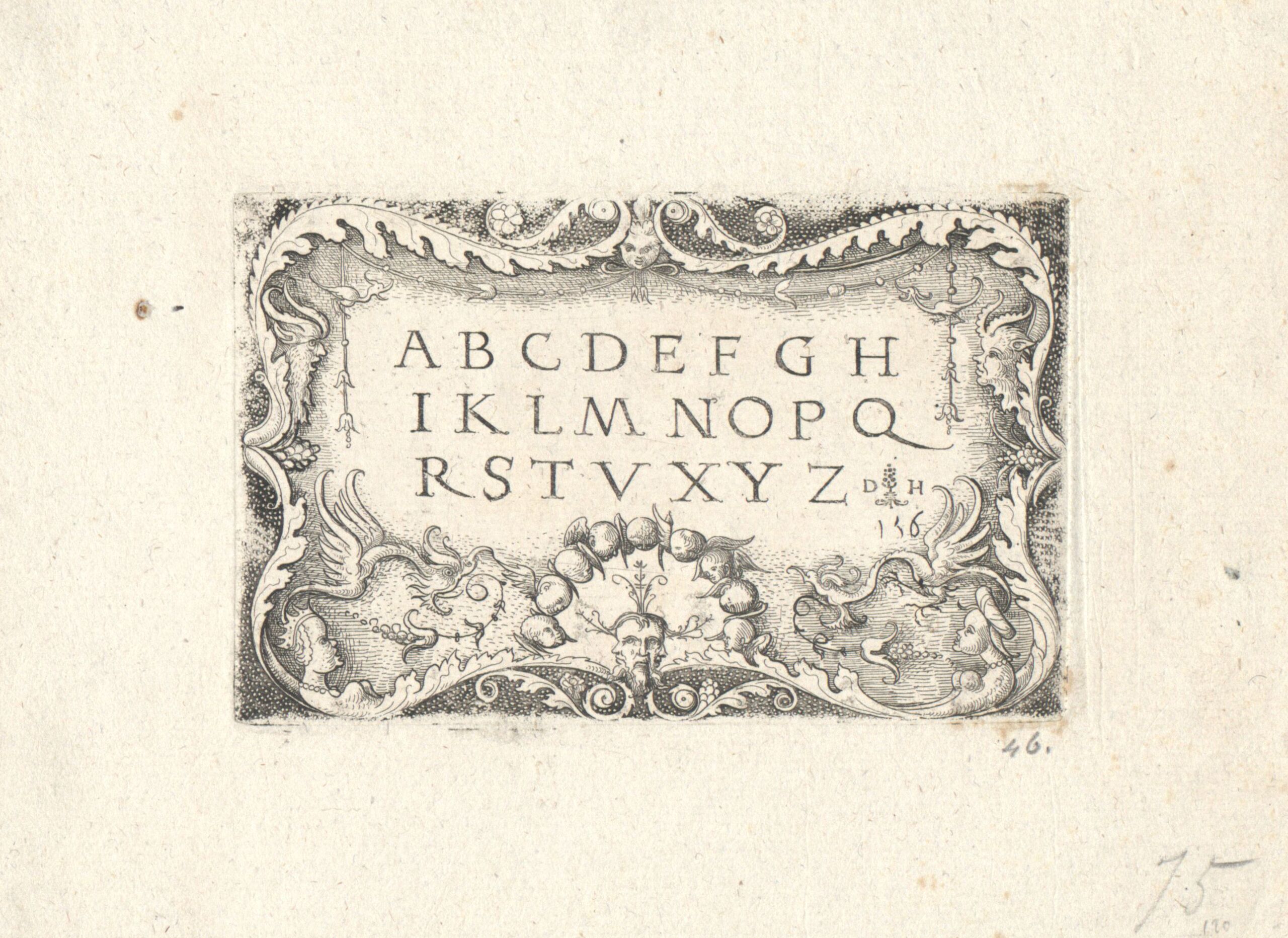 Alphabet, Lateinisches kleines Majuskel- Alphabet in einer Kartusche, mit Funck- Nummer 156, Daniel Hopfer, MAK Inv.nr. KI 1-1055