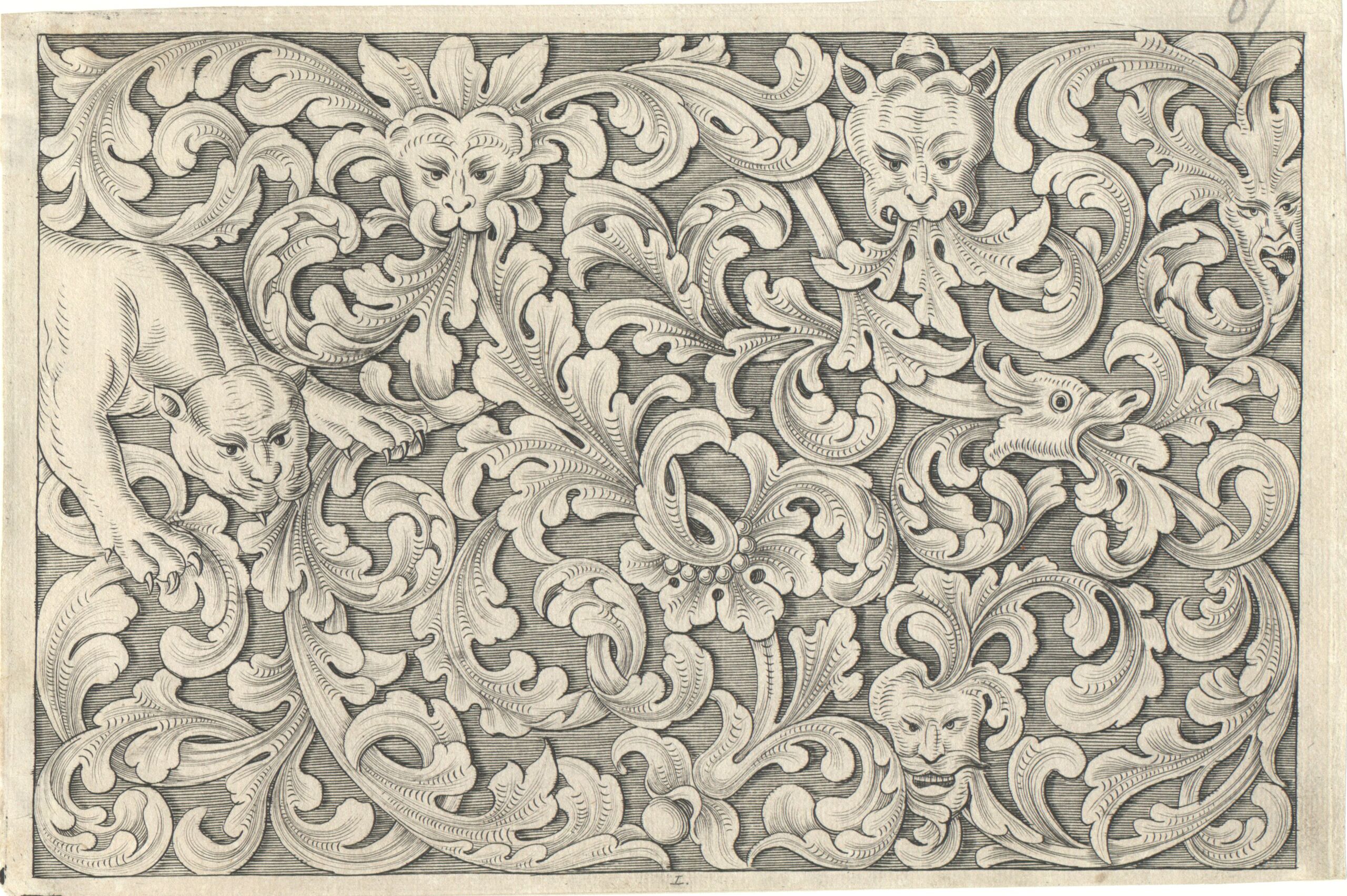 - Laubwerkornament für Schlosserarbeiten, Blatt 1 aus der Folge „Reiß= Büchlein Heinrich Ölckers Bürger und Hoff= Schloßers in Spremberg“, herausgegeben von J. C. Weigel (vom Bearbeiter vergebener Titel)