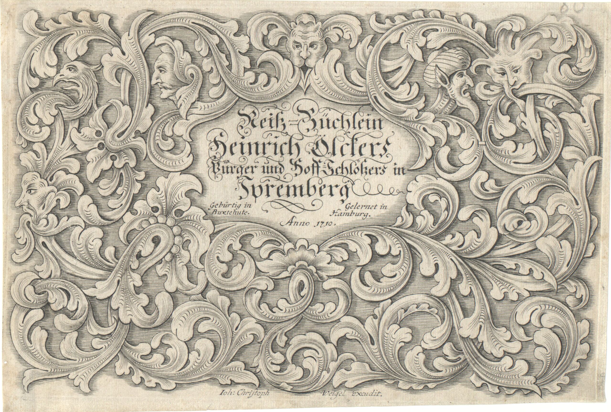 - Text am Objekt: Reiß= Büchlein/ Heinrich Ölckers/ Bürger und Hoff= Schloßers in/ Spremberg / Gebürtig in Buxtehute Gelernet in Hamburg / Anno 1710 / Joh. Christoph Weigel excudit