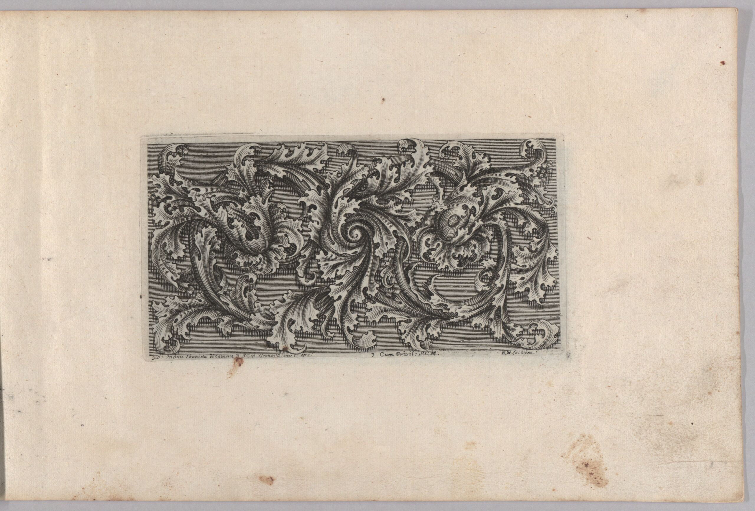 - Laubwerkranke, Blatt 1 aus der Folge „Nova Invenzione Di Rabeschi, e Fogliami Romani Di Giovanni Indau Ebonista di Camera della Sacra Cesarea Real, Maesta dell’ Imperatrice Eleonora Con Gratia e Privilegio S. C. R. M. Stampati in Vienna Anno 1686”, gebundenes Heft mit 6 Blatt Laub- und Rankenwerk (vom Bearbeiter vergebener Titel)