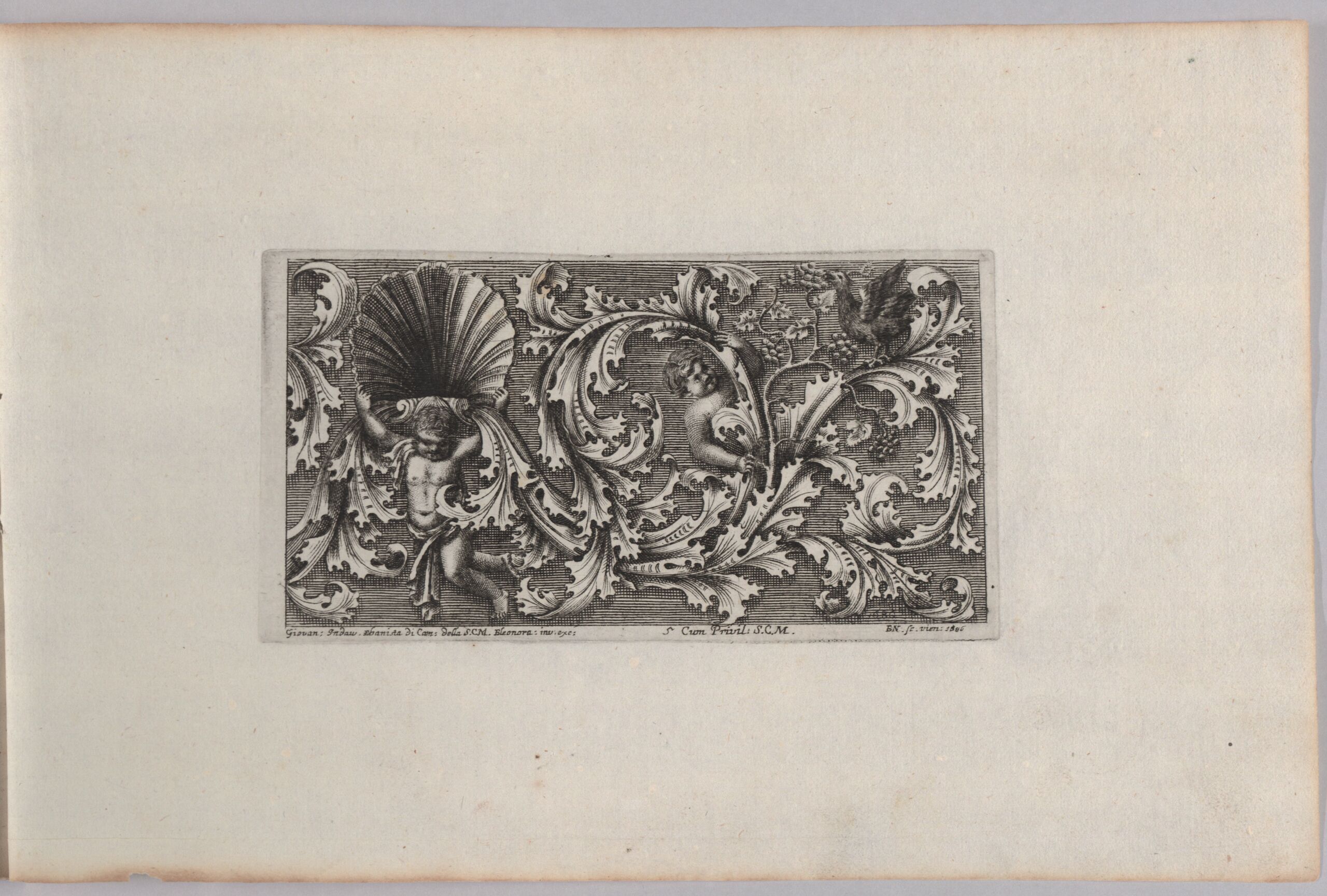 Ornamentstich, Laubwerkranke mit zwei Putti und einem Vogel, Blatt 5 aus der Folge „Nova Invenzione Di Rabeschi, e Fogliami Romani Di Giovanni Indau Ebonista di Camera della Sacra Cesarea Real, Maesta dell’ Imperatrice Eleonora Con Gratia e Privilegio S. C. R. M. Stampati in Vienna Anno 1686”, gebundenes Heft mit 6 Blatt Laub- und Rankenwerk, Johann Indau, MAK Inv.nr. KI 15136-6