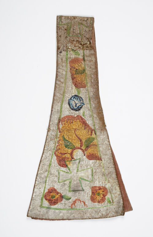 Kasel, Lederkasel, Stab silber, Seitenteile grün mit silber, gold, rot u. blauen Blüten, Anonym, MAK Inv.nr. LE 120-1