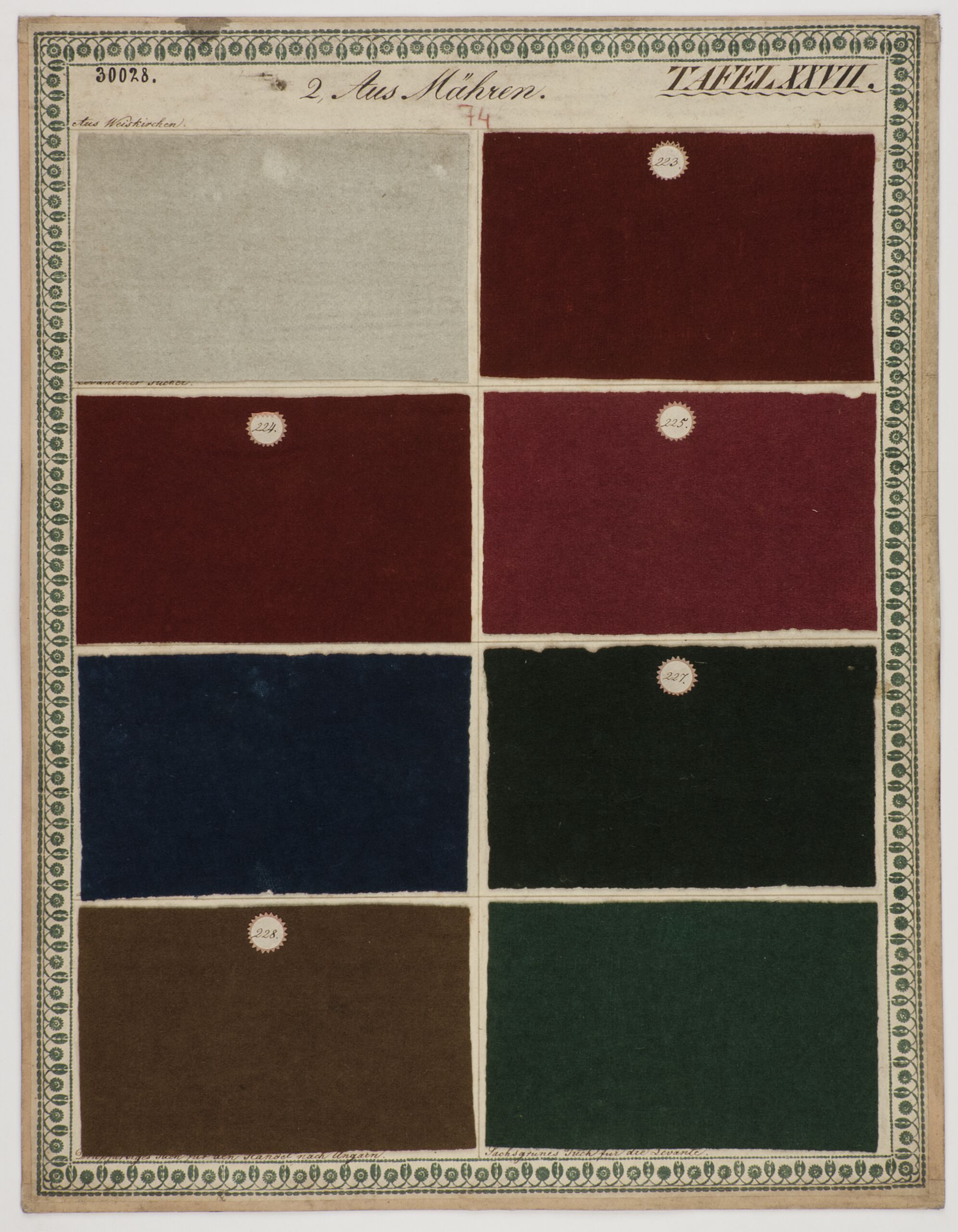 - Beschriftung (Vorderseite) : 2. Aus Mähren. / Aus Weißkirchen. / Levantiner Tücher. / Drapfarbiges Tuch für den Handel nach Ungarn. / Lachsgrünes Tuch für die Levante.