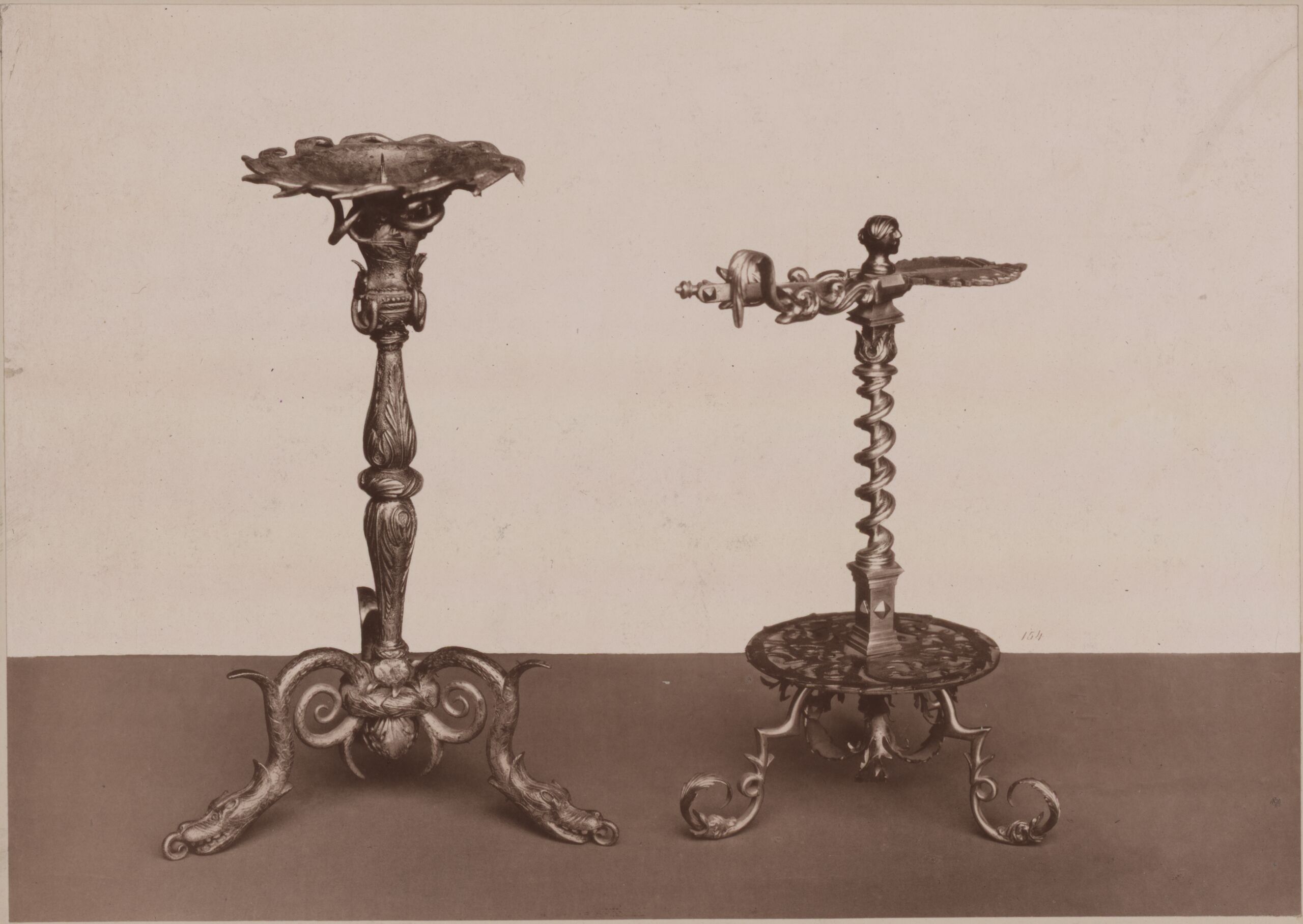 - Text am Objekt: [Untersatzkarton, mittig, aufgeklebt]: 154. 1) Leuchter mit Kneifscheere zum Halten eines Wachs- / stockes. Eisen geschmiedet und geschnitten. XVIII. / Jahrh. Deutsches Gewerbe-Museum. / 2) Leuchter. Eisen geschnitten. Natürliche Grösse. / Italien XVI. Jahrh. Director Dr. Friedländer