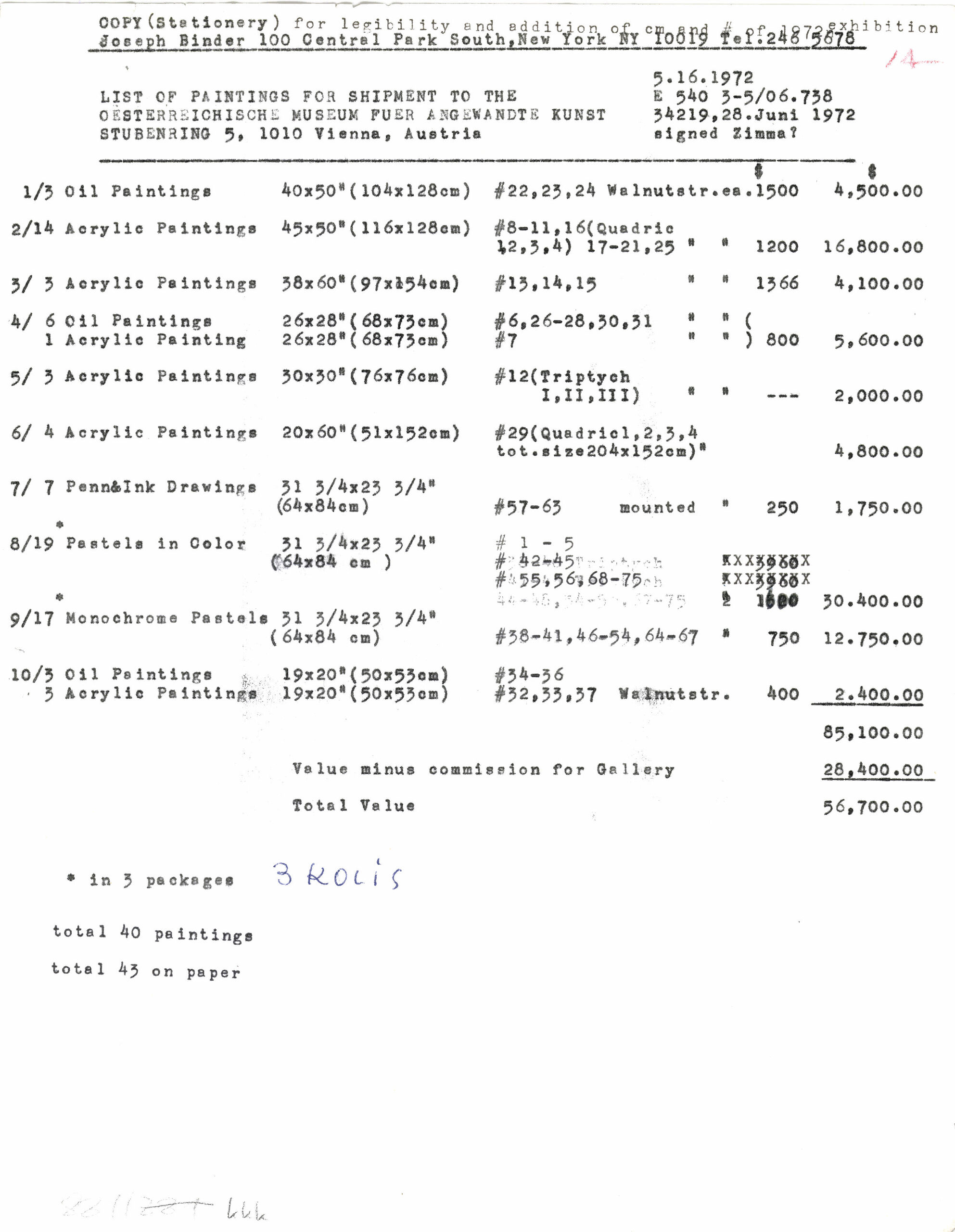 - Listen von Werken Joseph Binders für die Ausstellung "Joseph Binder. Nonobjective Art" im Österreichischen Museum für angewandte Kunst, MAK vom 15.9. bis 29.10.1972 (vom Bearbeiter vergebener Titel)