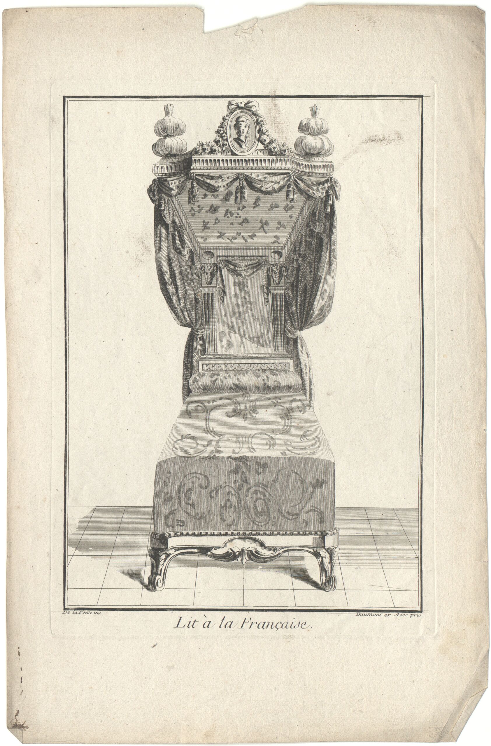 Ornamentstich, „Lit à la Francaise.“, Blatt aus einer Folge von Betten (Folge D?) aus dem Reihenwerk, herausgegeben von Daumont, Jean-Charles Delafosse, MAK Inv.nr. KI 15262-15