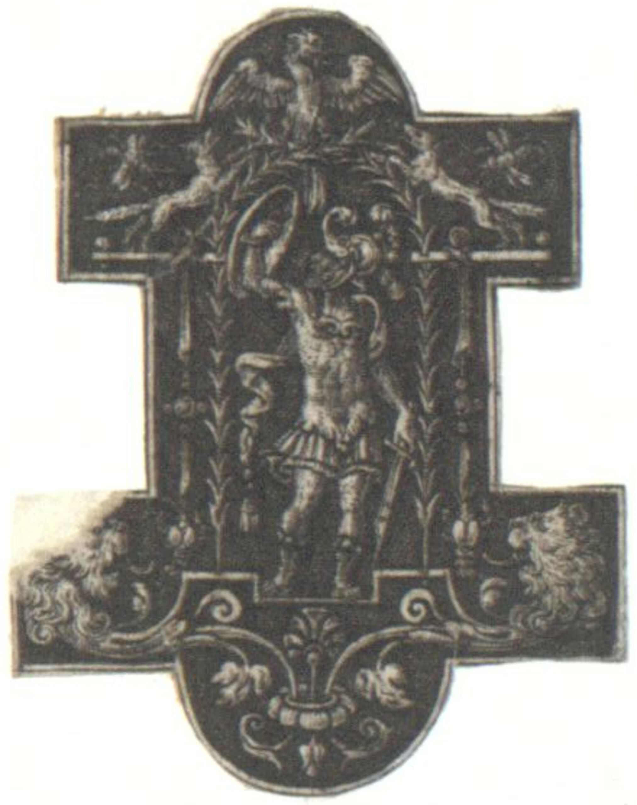 - Mars, Blatt aus der Folge von Ornamentstichen in Form eines lothringischen Kreuzes (Robert- Dumesnil Nr. 395) (vom Bearbeiter vergebener Titel)