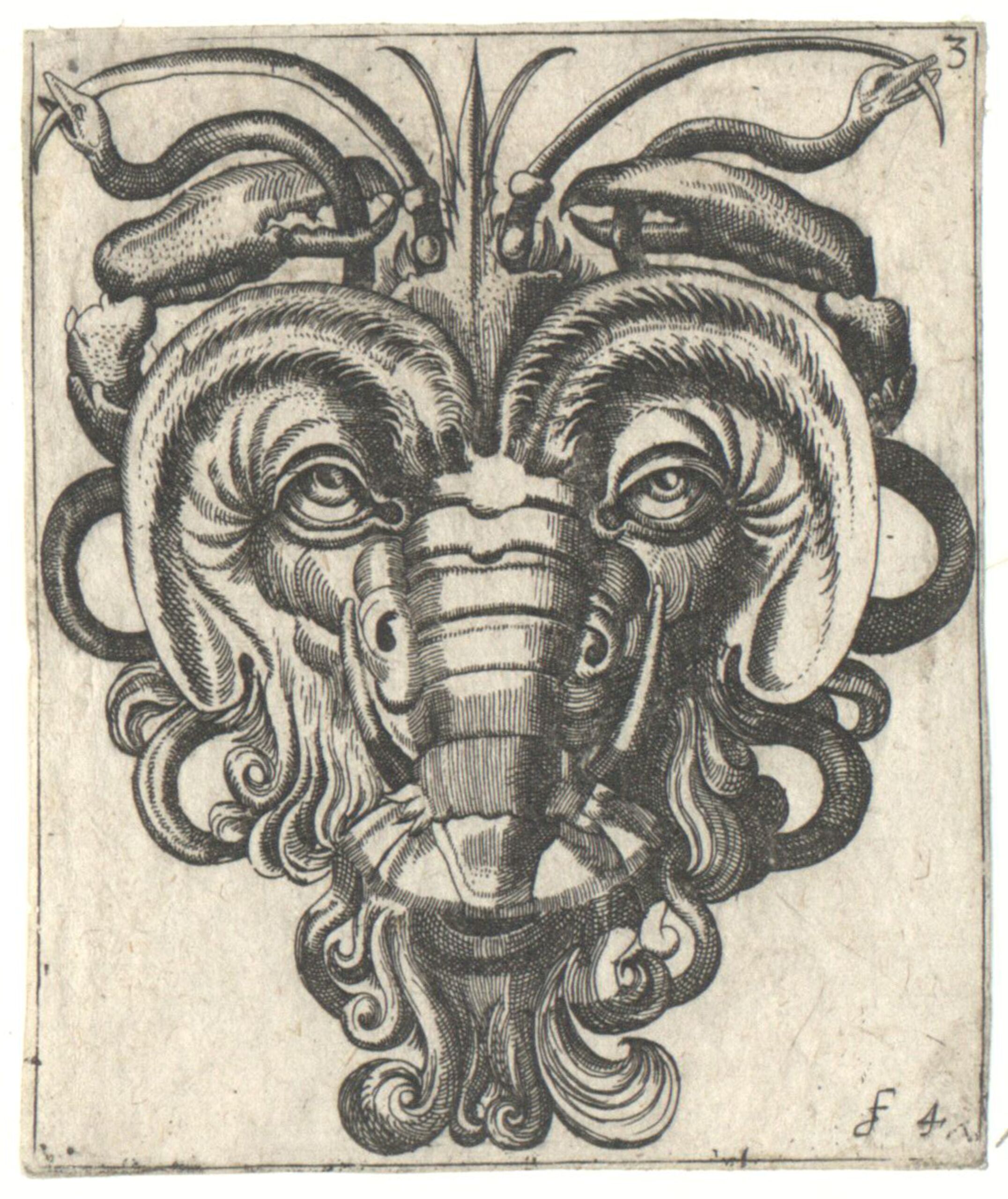 - Maskenkopf, Blatt 3 aus einer Folge von Aufsatzhälften und Masken, Kopien nach Frans Huys (vom Bearbeiter vergebener Titel)