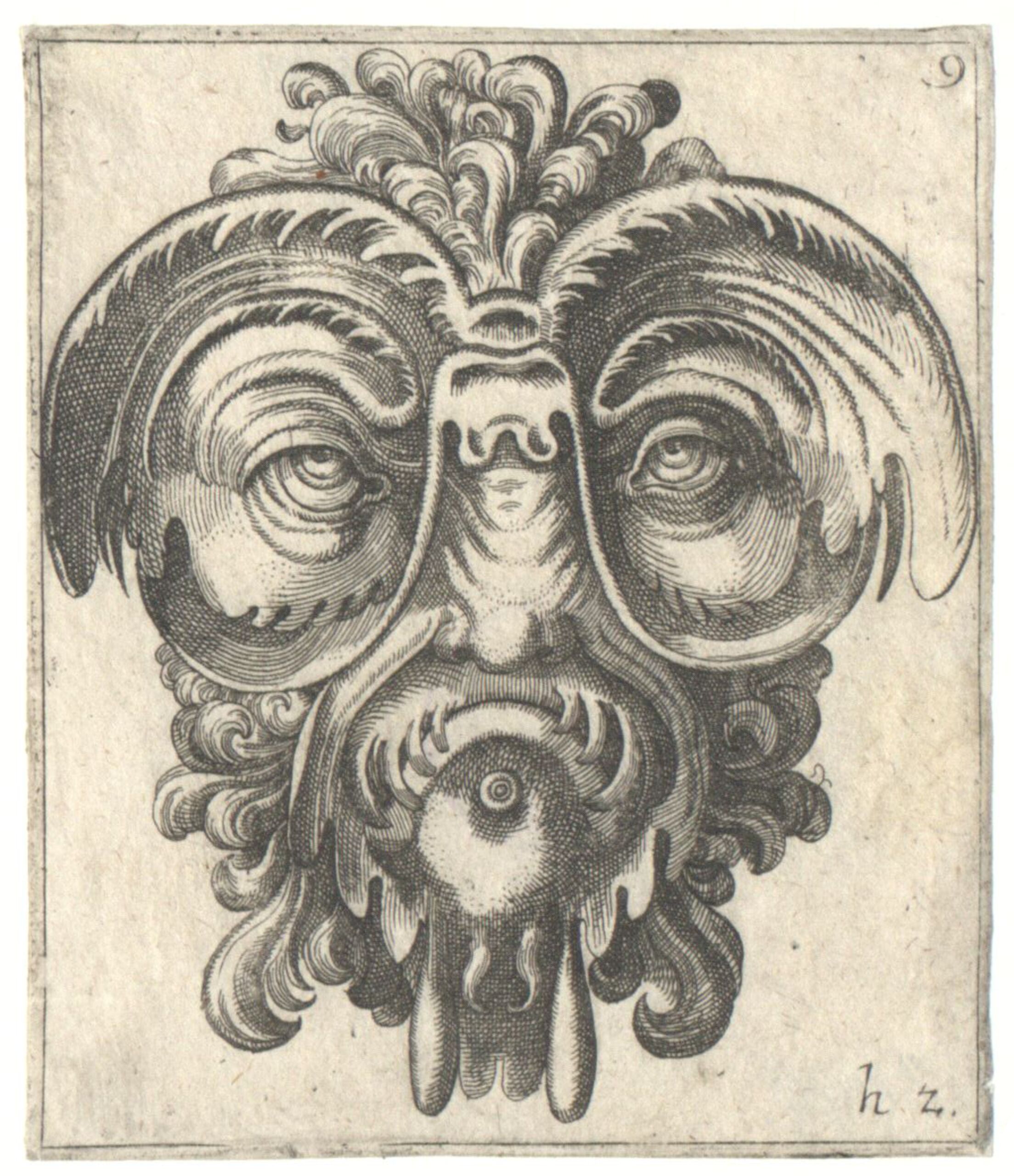 - Maskenkopf, Blatt 9 aus einer Folge von Aufsatzhälften und Masken, Kopien nach Frans Huys (vom Bearbeiter vergebener Titel)