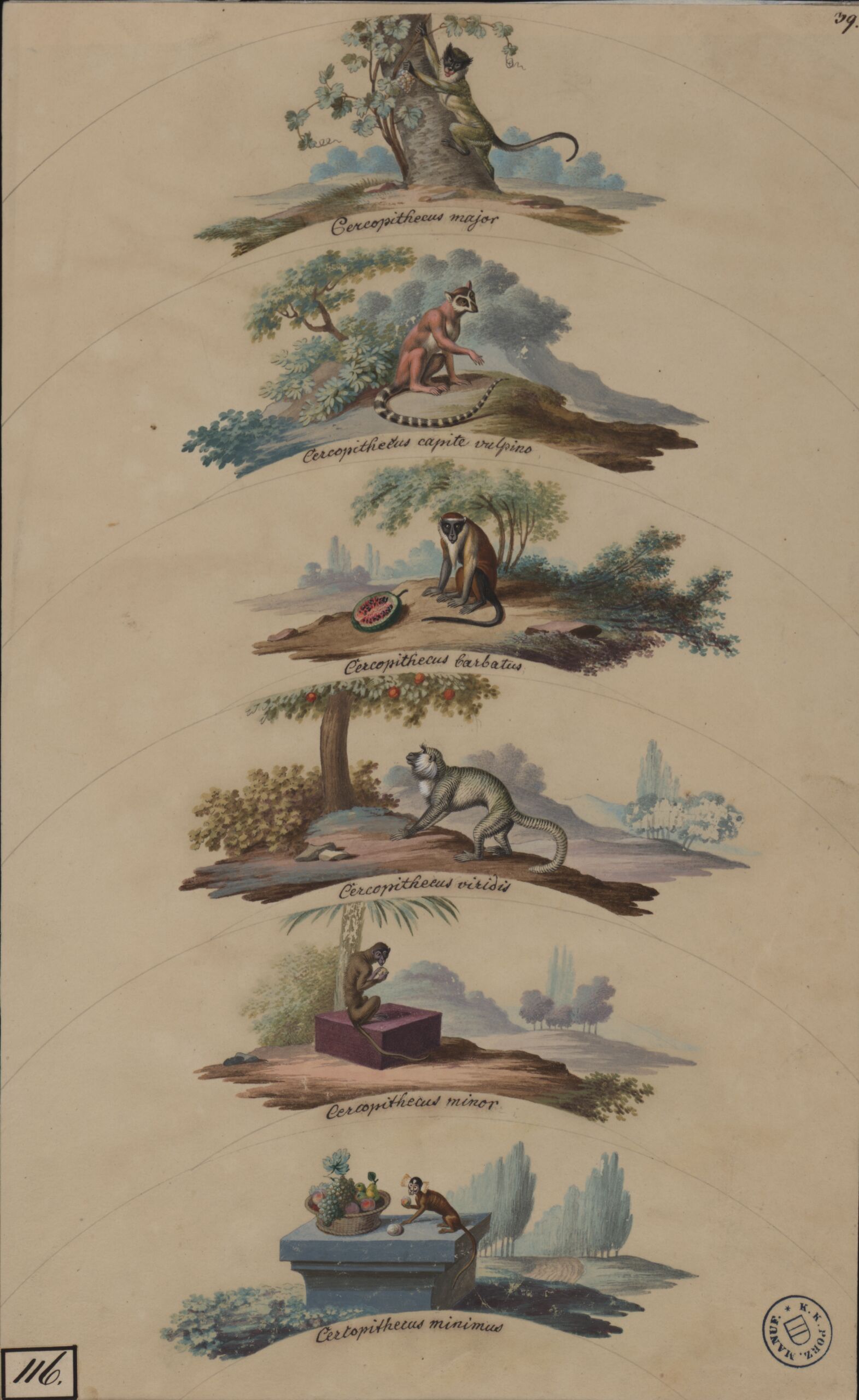 - Text am Objekt: 39. / Cercopithecus major / Cercopithecus capite vulpino / Cercopithecus barbatus / Cercopithecus viridis / Cercopithecus minor / Cercopithecus minimus