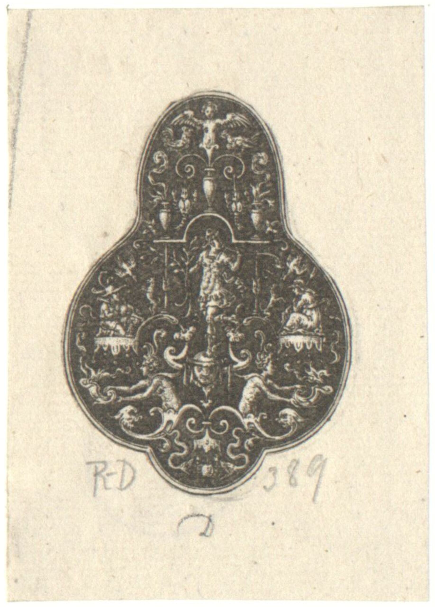 - Ornamentstich, Perseus, Blatt aus der Folge der ovalen Anhänger auf schraffiertem Grund (Robert- Dumesnil Nr. 385)