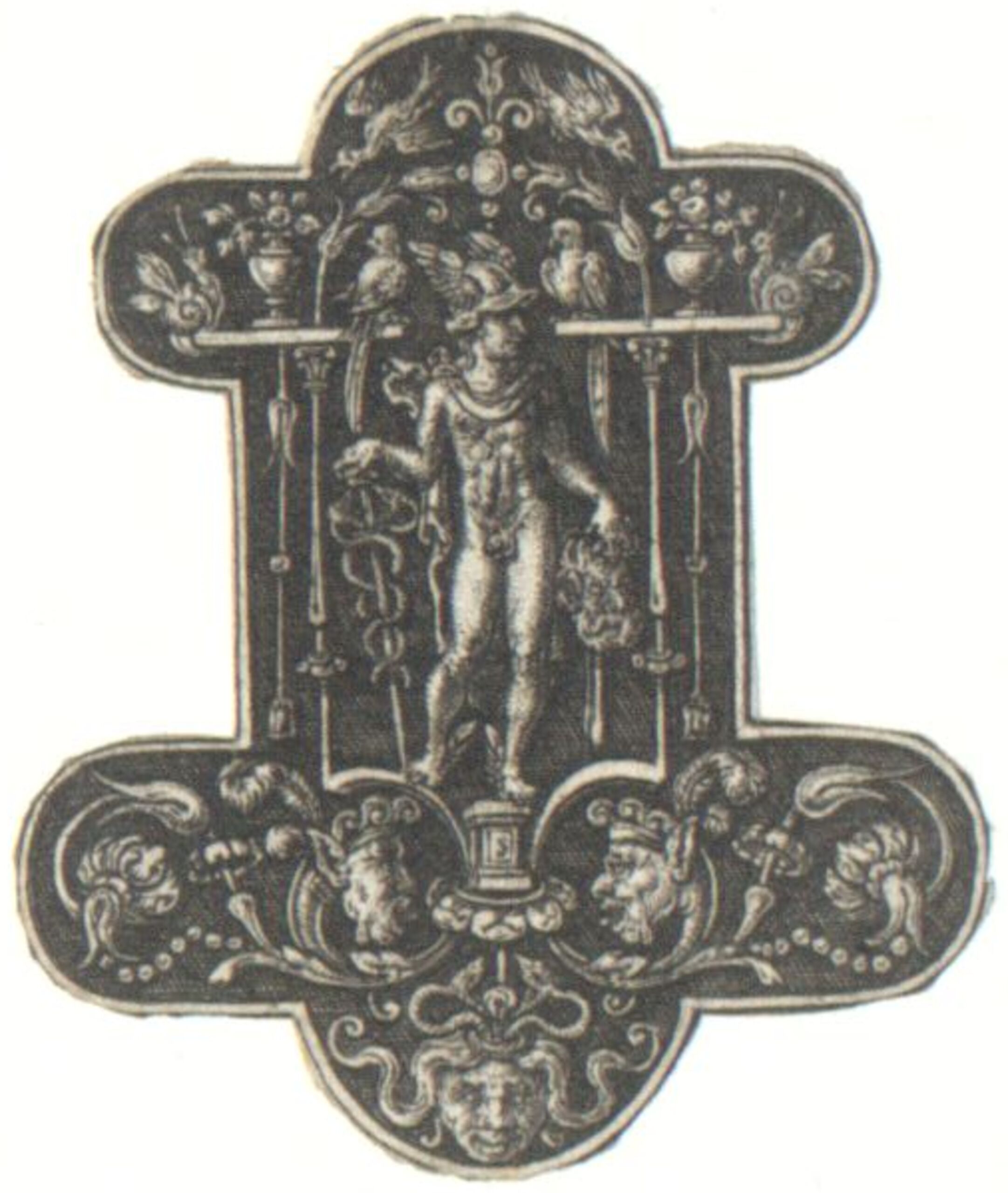 Ornamentstich, Merkur, Blatt aus der Folge von Ornamentstichen in Form eines lothringischen Kreuzes (Robert- Dumesnil Nr. 392), Etienne Delaune, MAK Inv.nr. KI 717-3