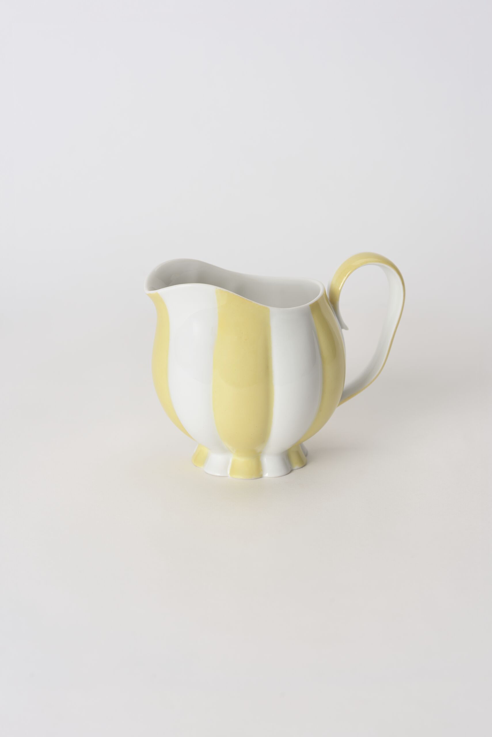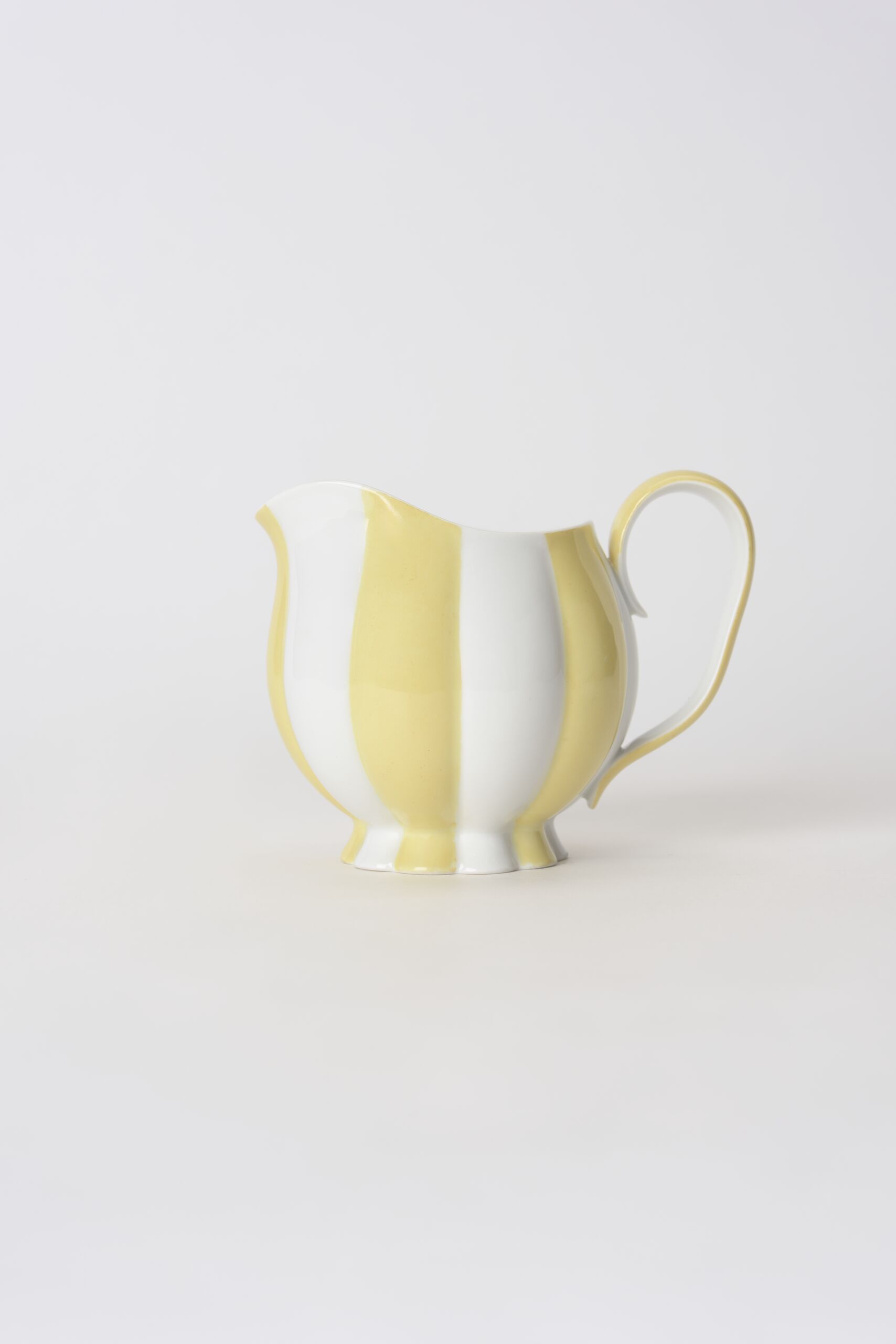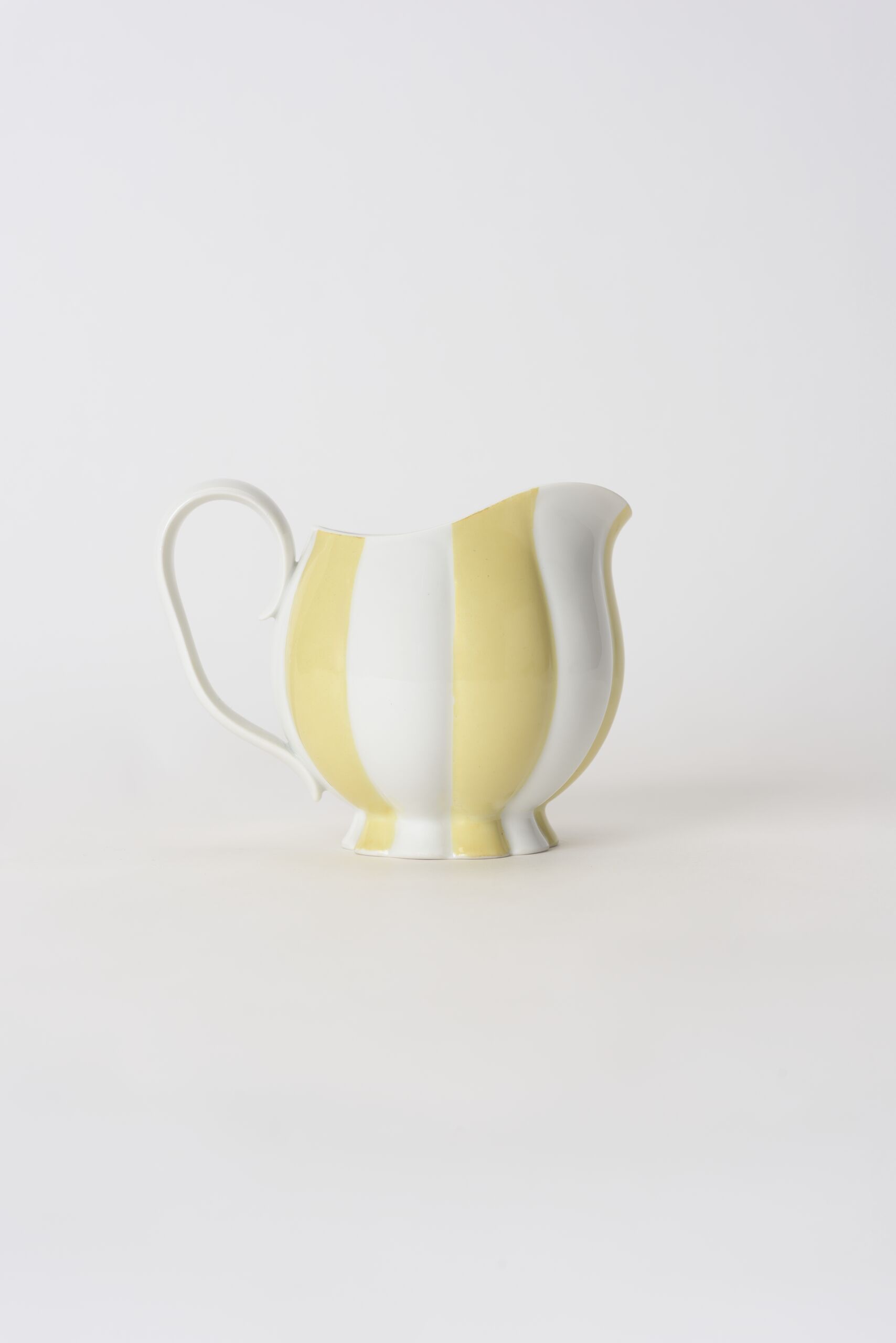 - Milchkännchen, reliefiert, wie eine Melone, Porzellan, weißer Scherben, gegossen, Henkel garniert, glänzend transparent glasiert, gelb bemalt (jede zweite „Spalte“)