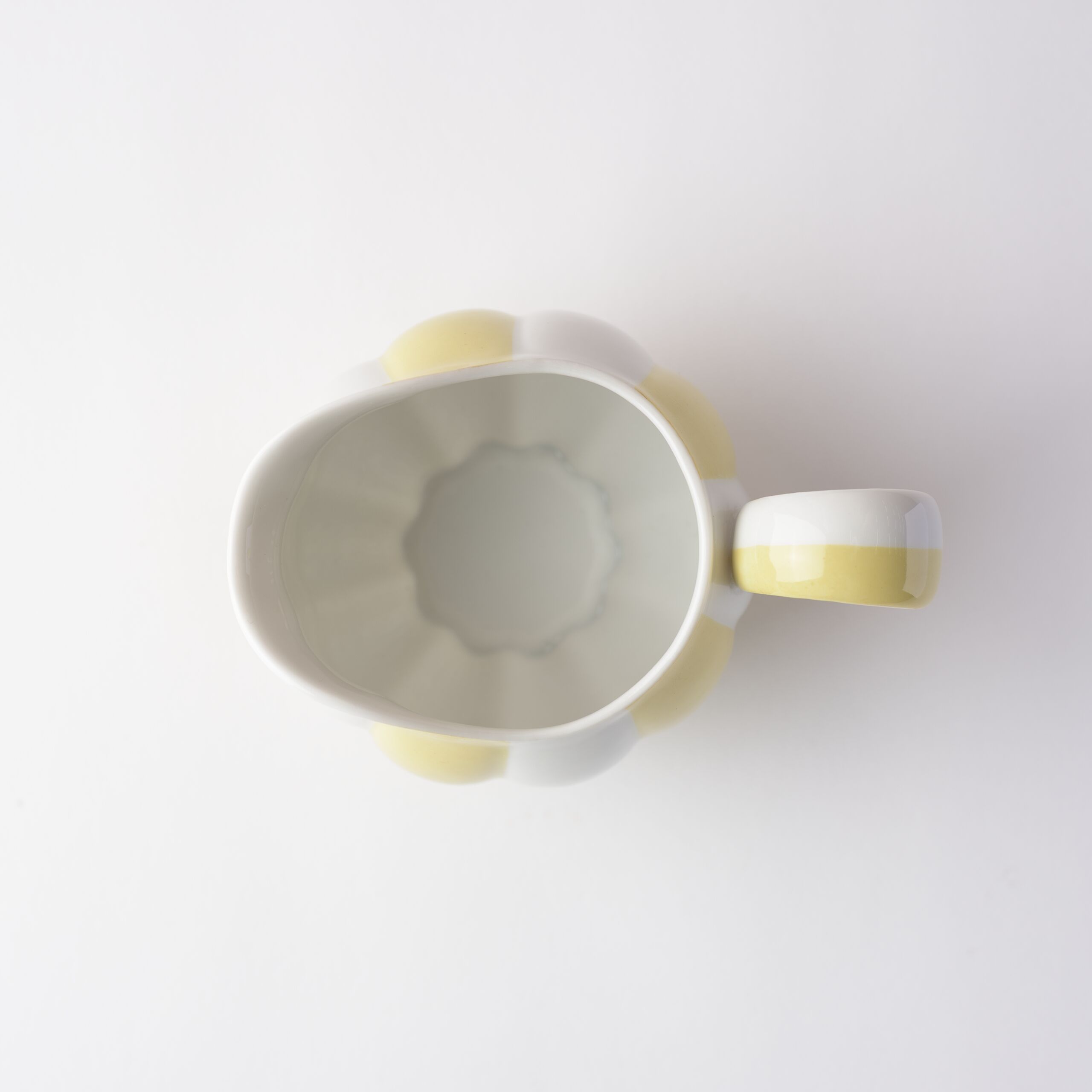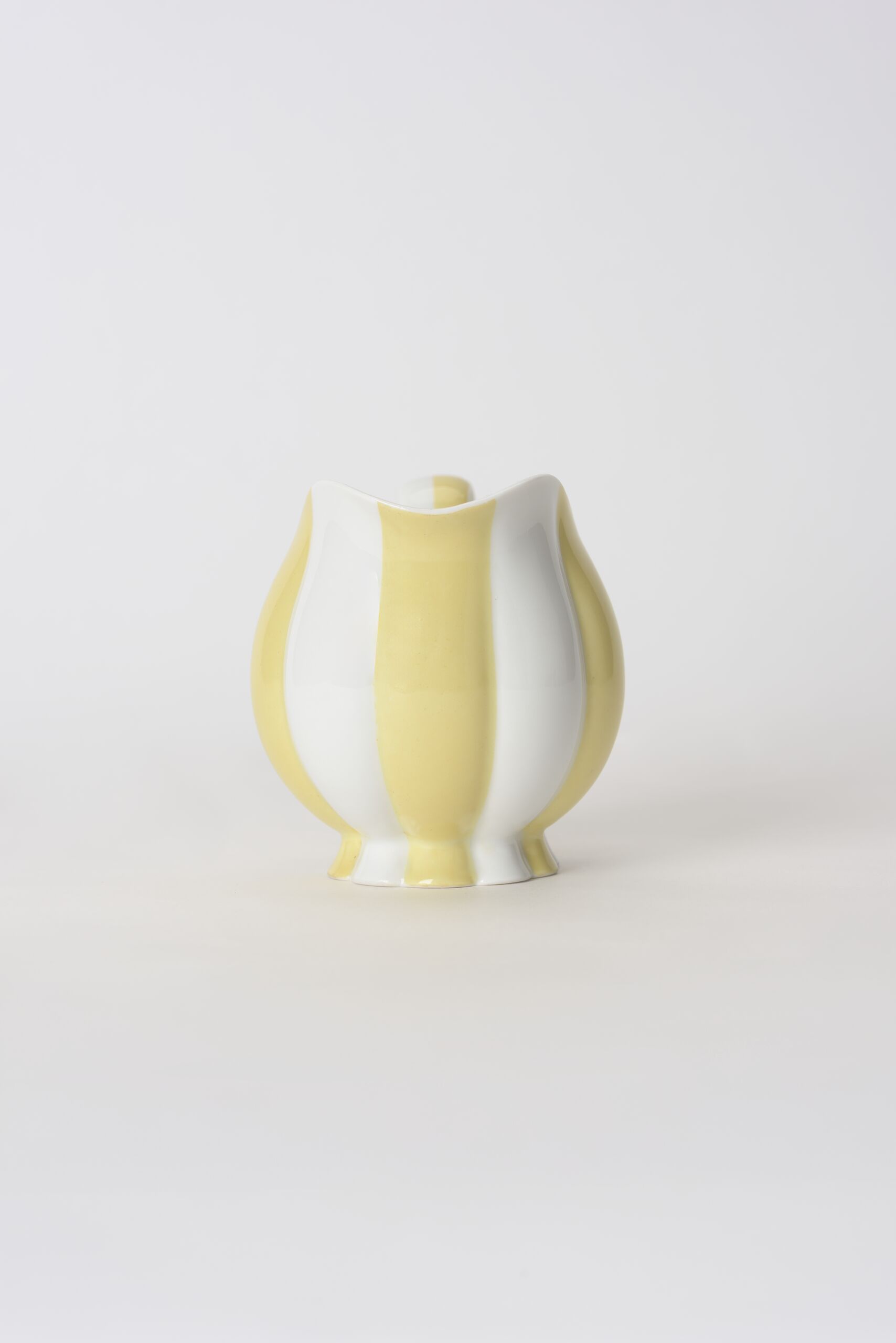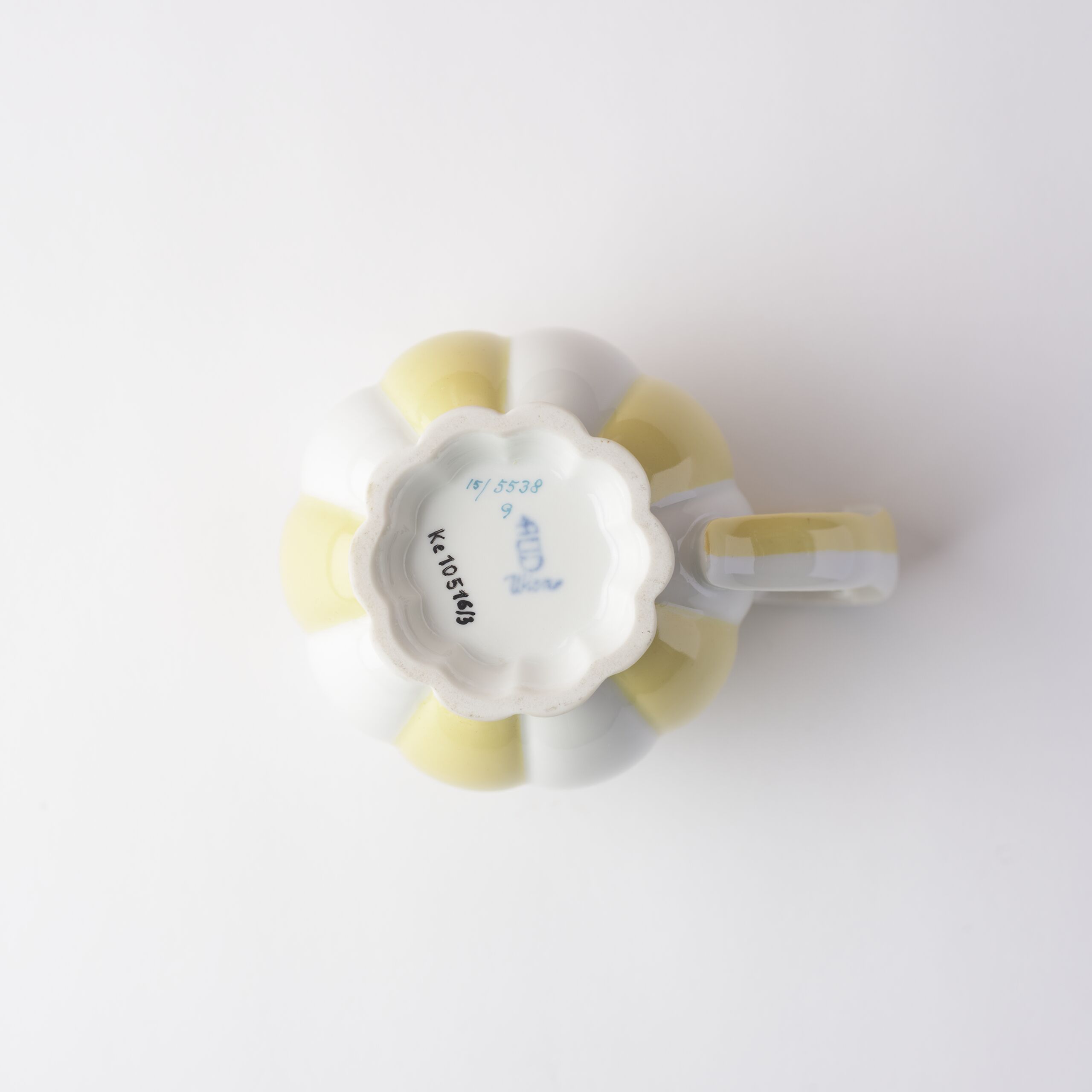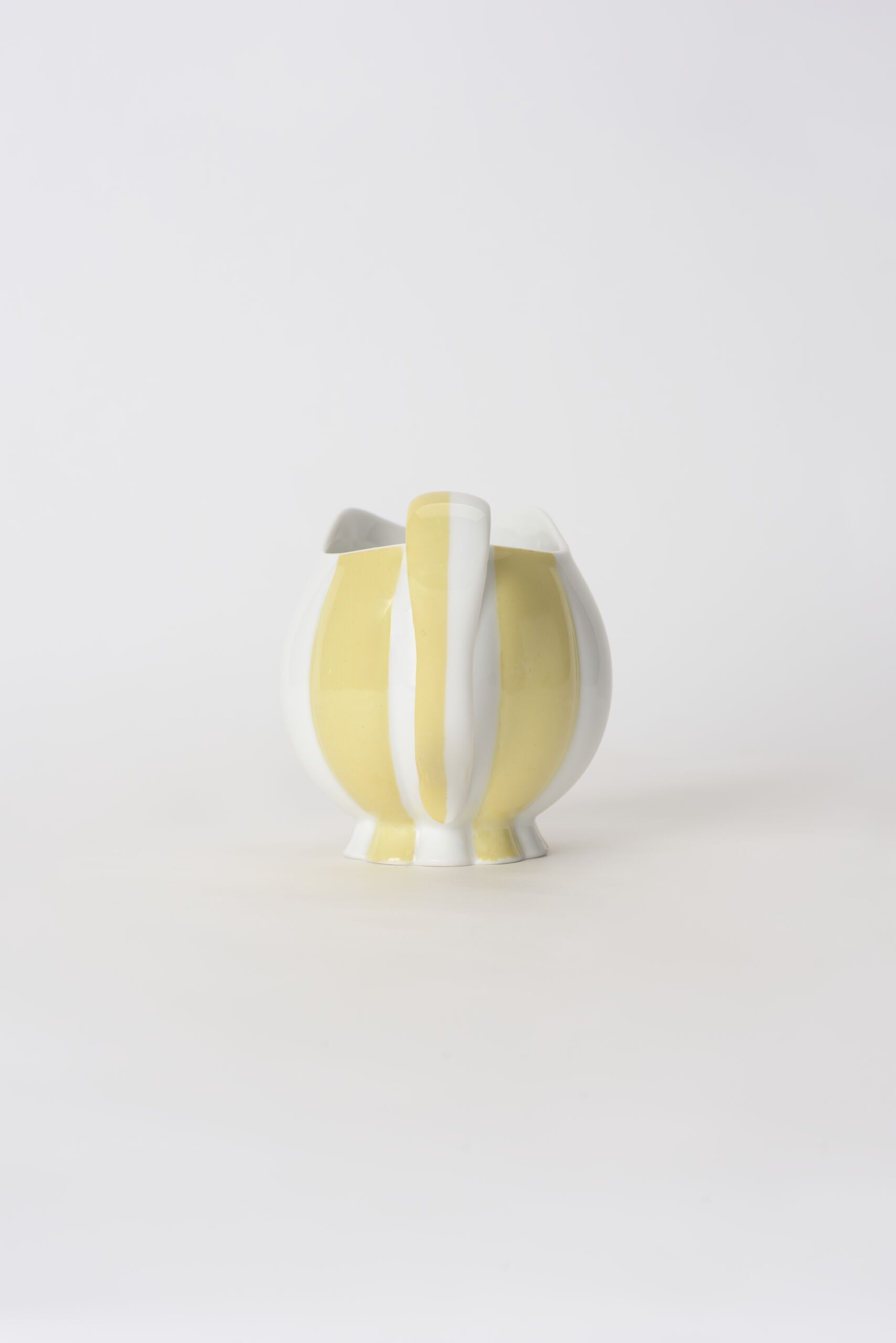 - Milchkännchen, reliefiert, wie eine Melone, Porzellan, weißer Scherben, gegossen, Henkel garniert, glänzend transparent glasiert, gelb bemalt (jede zweite „Spalte“)