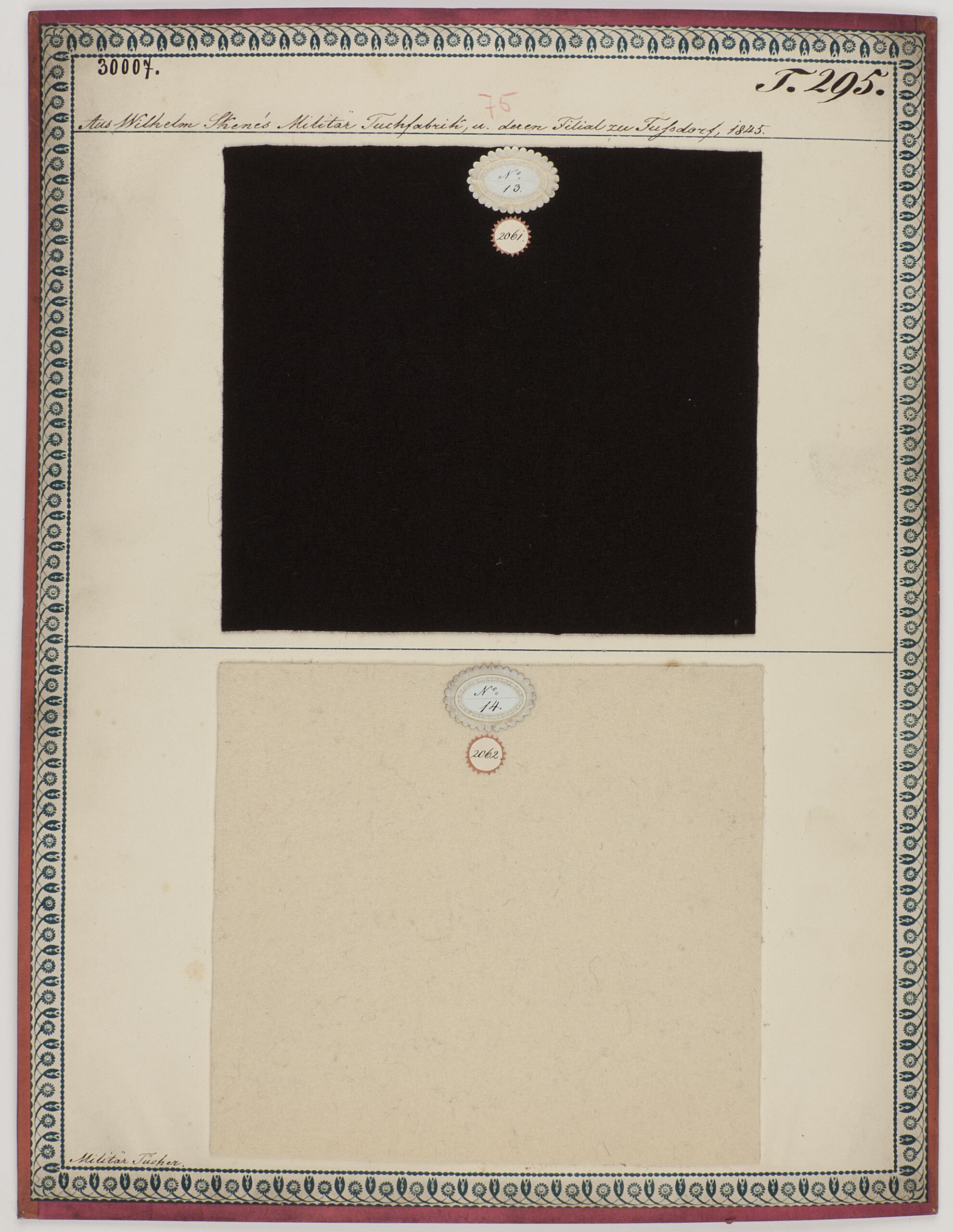 - Beschriftung (Vorderseite) : Aus Wilhelm Skene's Militär-Tuchfabrik, u. derne Filial zu Fußdorf, 1845. / Militär Tücher.