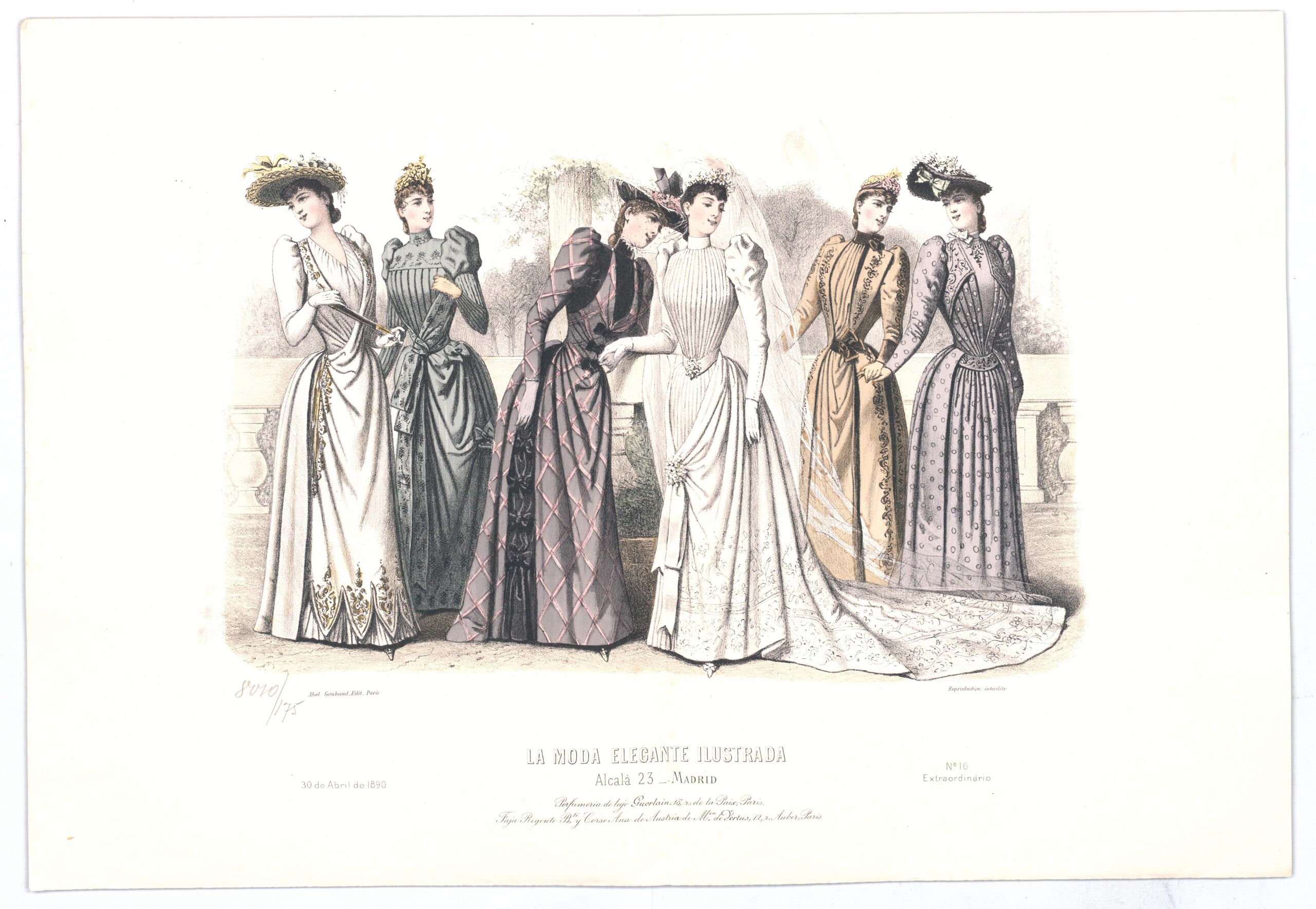 - Text am Objekt: [Links unten:] Abel Goubaud, Edit. Paris / 30 de Abril de 1890. [Unten in der Mitte:] LA MODA ELEGANTE ILUSTRADA / Alcalà 23_Madrid / Perfumeria de lujo Guerlain, 15, r. de la Paix, Paris, / Faja Regente Bté. y Corse Ana de Austria de Mon. de Vertus, 12, r. Auber, Paris. [Rechts unten:] Reproduction interdite / No. 16 / Extraordinário [Gedruckter Text]