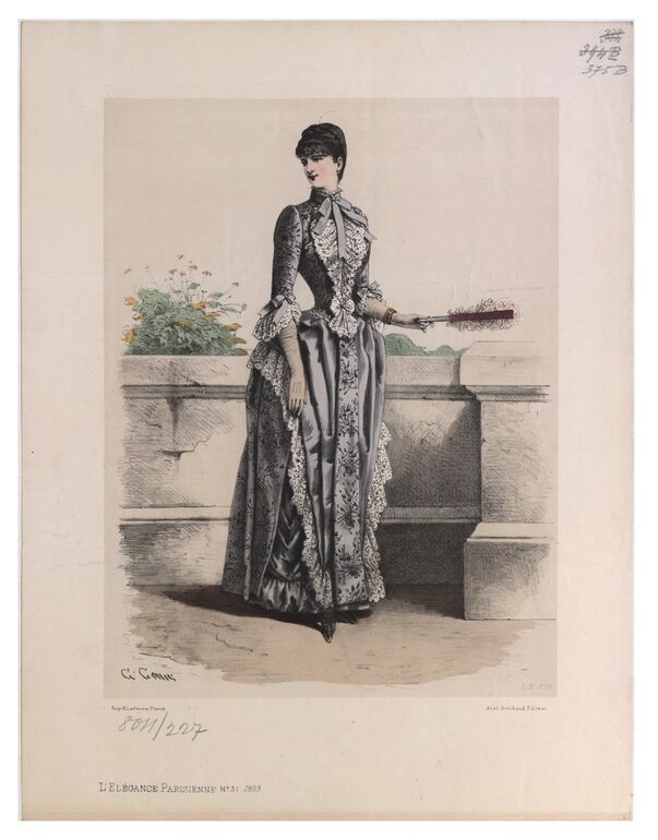 - Text am Objekt: G. Gonin; L. N 557; Imp H. Lefévre Paris; Reproduction Interdite; Abel Goubaud Editeur; Le Moniteur de la Mode, la gazette rose / le bon ton & l'elégance parisienne réunis; N° 10 1887 / Administration, / 3, Rue du 4 Septembre, PARIS