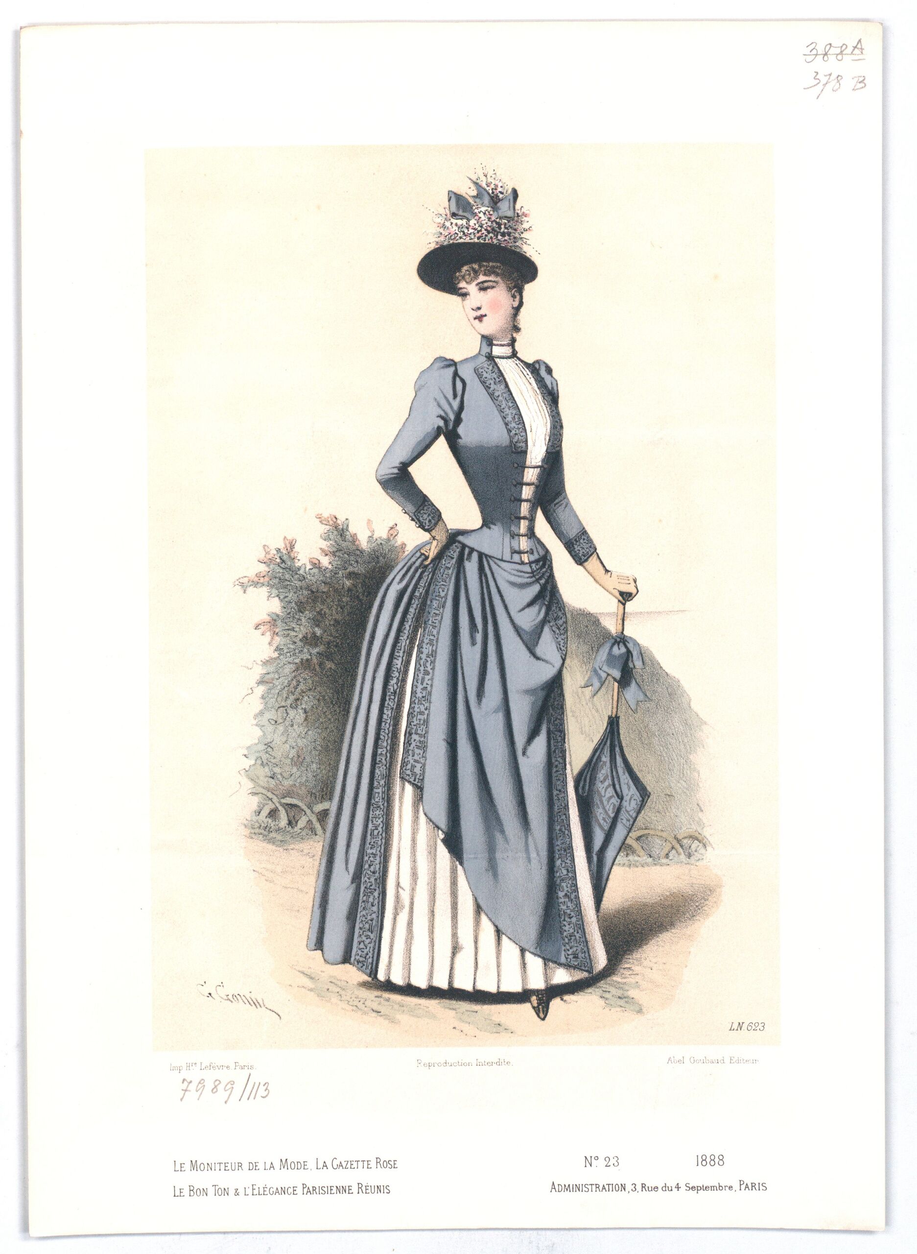 - Text am Objekt: G. Gonin; LN 623; Imp H. Lefévre Paris; Reproduction Interdite; Abel Goubaud Editeur; Le Moniteur de la Mode, la gazette rose / le bon ton & l'elégance parisienne réunis; N° 23 1888 / Administration, / 3, Rue du 4 Septembre, PARIS
