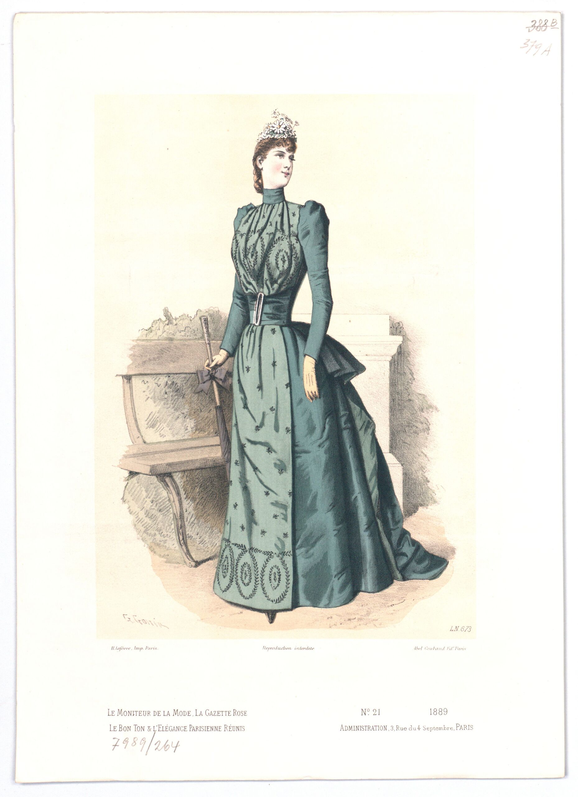 - Text am Objekt: G. Gonin; LN 673; Imp H. Lefévre Paris; Reproduction Interdite; Abel Goubaud Editeur; Le Moniteur de la Mode, la gazette rose / le bon ton & l'elégance parisienne réunis; N° 21 1889 / Administration, / 3, Rue du 4 Septembre, PARIS