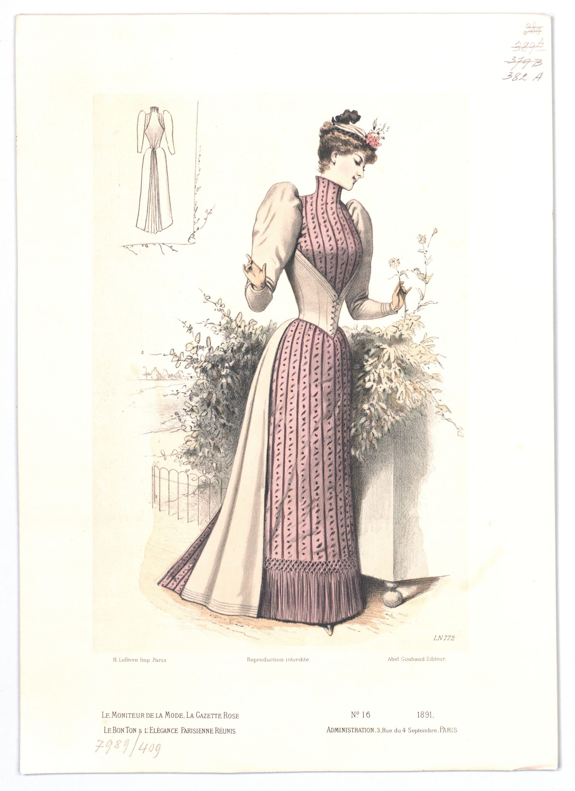 - Text am Objekt: LN 772; H. Lefévre. Imp. Paris; Reproduction Interdite; Abel Goubaud Editeur; Le Moniteur de la Mode, la gazette rose / le bon ton & l'elégance parisienne réunis; N° 16 1891 / Administration, / 3, Rue du 4 Septembre, PARIS