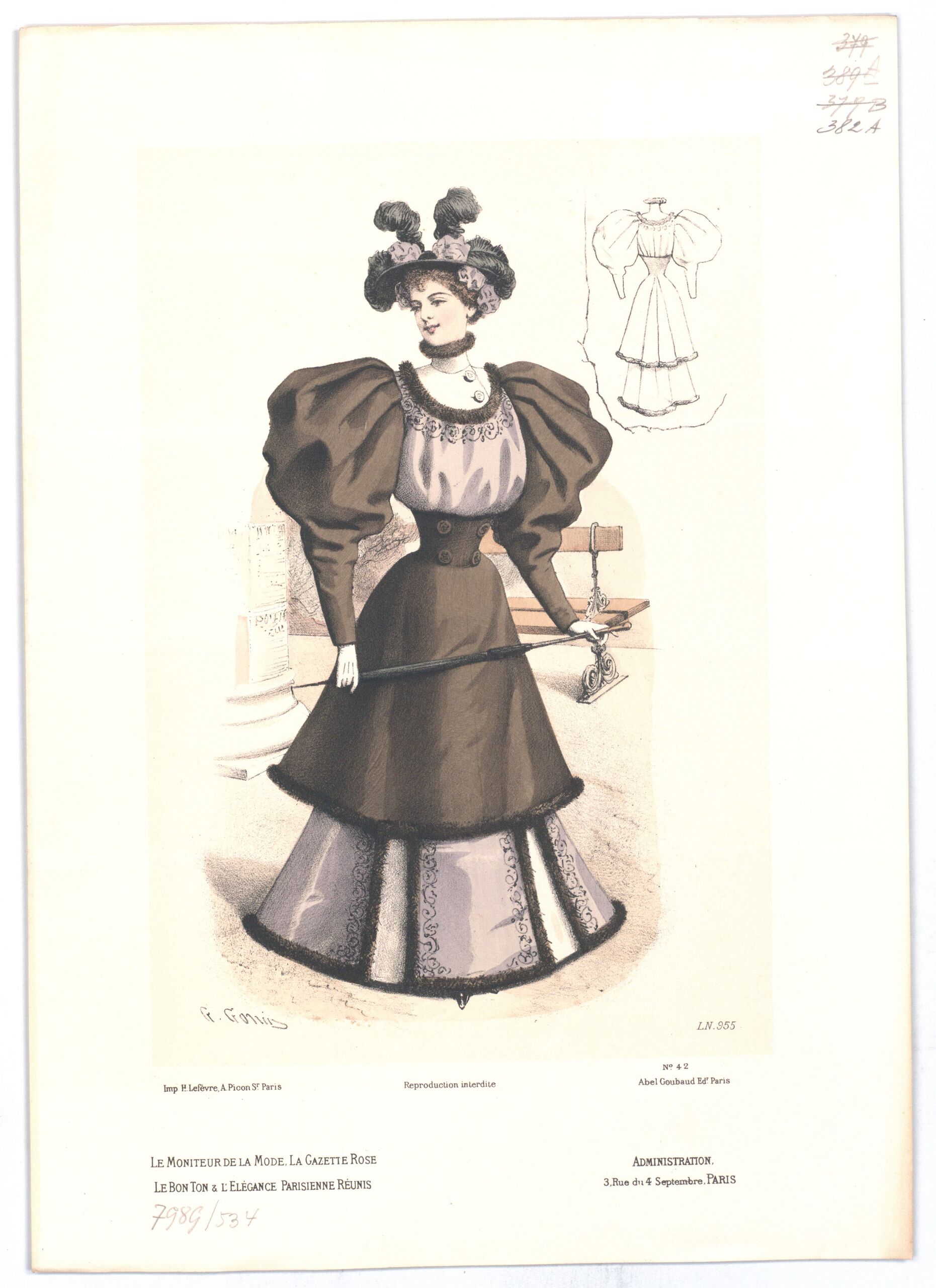 - Text am Objekt: G. Gonin; LN 955; Imp. H. Lefévre. A. Picon Suc. Paris; Reproduction Interdite; Abel Goubaud Editeur; Le Moniteur de la Mode, la gazette rose / le bon ton & l'elégance parisienne réunis; N° 42 / Administration, / 3, Rue du 4 Septembre, PARIS