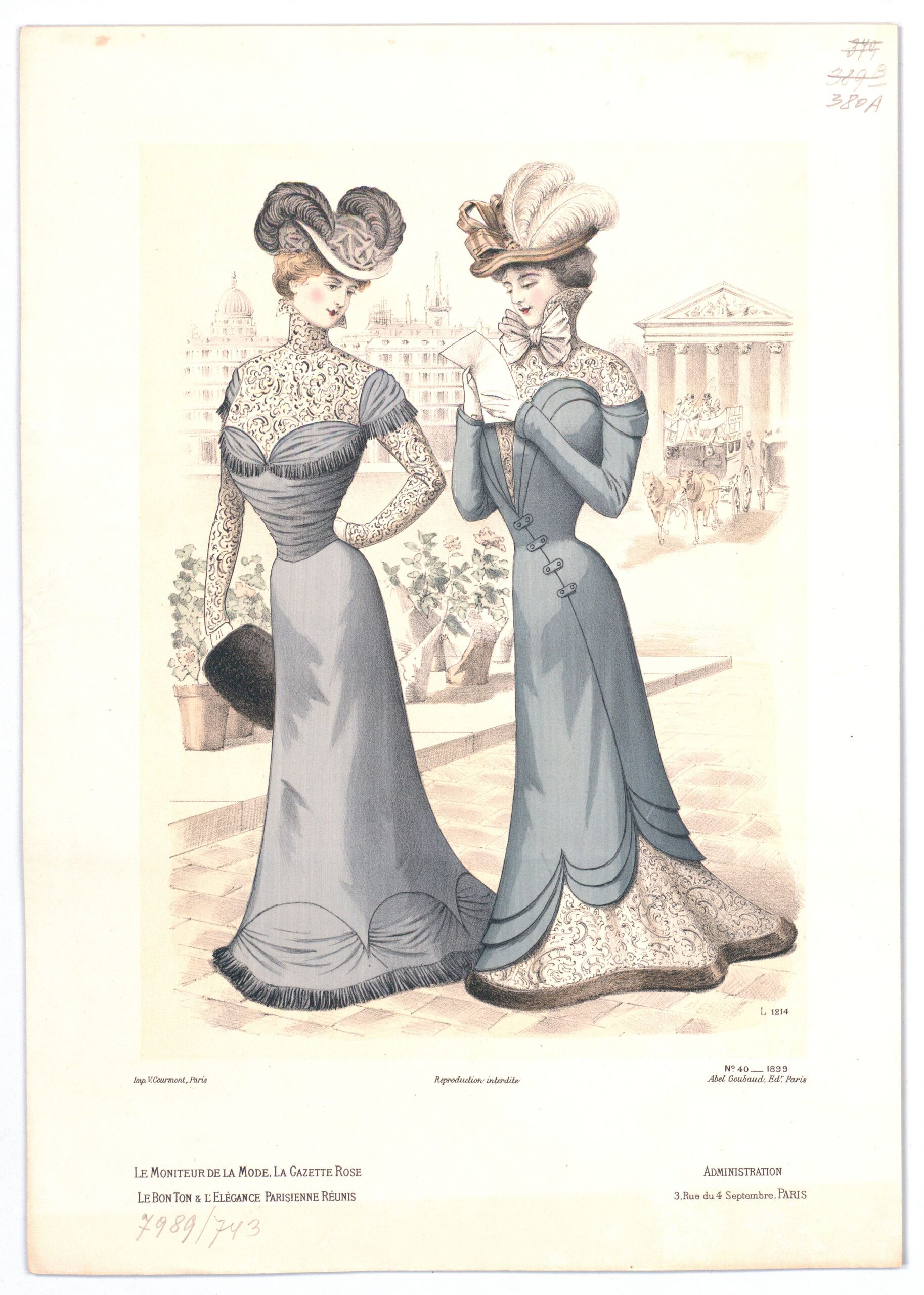- Text am Objekt: L 1214; N° 40 1899; Imp. V. Courmont, Paris; Reproduction Interdite; Abel Goubaud Ed. Paris; Le Moniteur de la Mode, la gazette rose / le bon ton & l'elégance parisienne réunis; Administration / 3, Rue du 4 Septembre, PARIS
