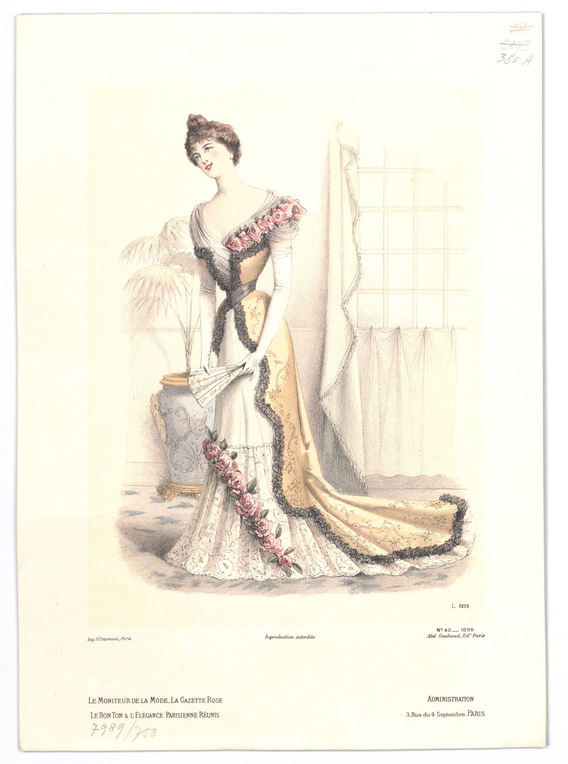 - Text am Objekt: L 1219; N° 45 1899; Imp. V. Courmont, Paris; Reproduction Interdite; Abel Goubaud Ed. Paris; Le Moniteur de la Mode, la gazette rose / le bon ton & l'elégance parisienne réunis; Administration / 3, Rue du 4 Septembre, PARIS