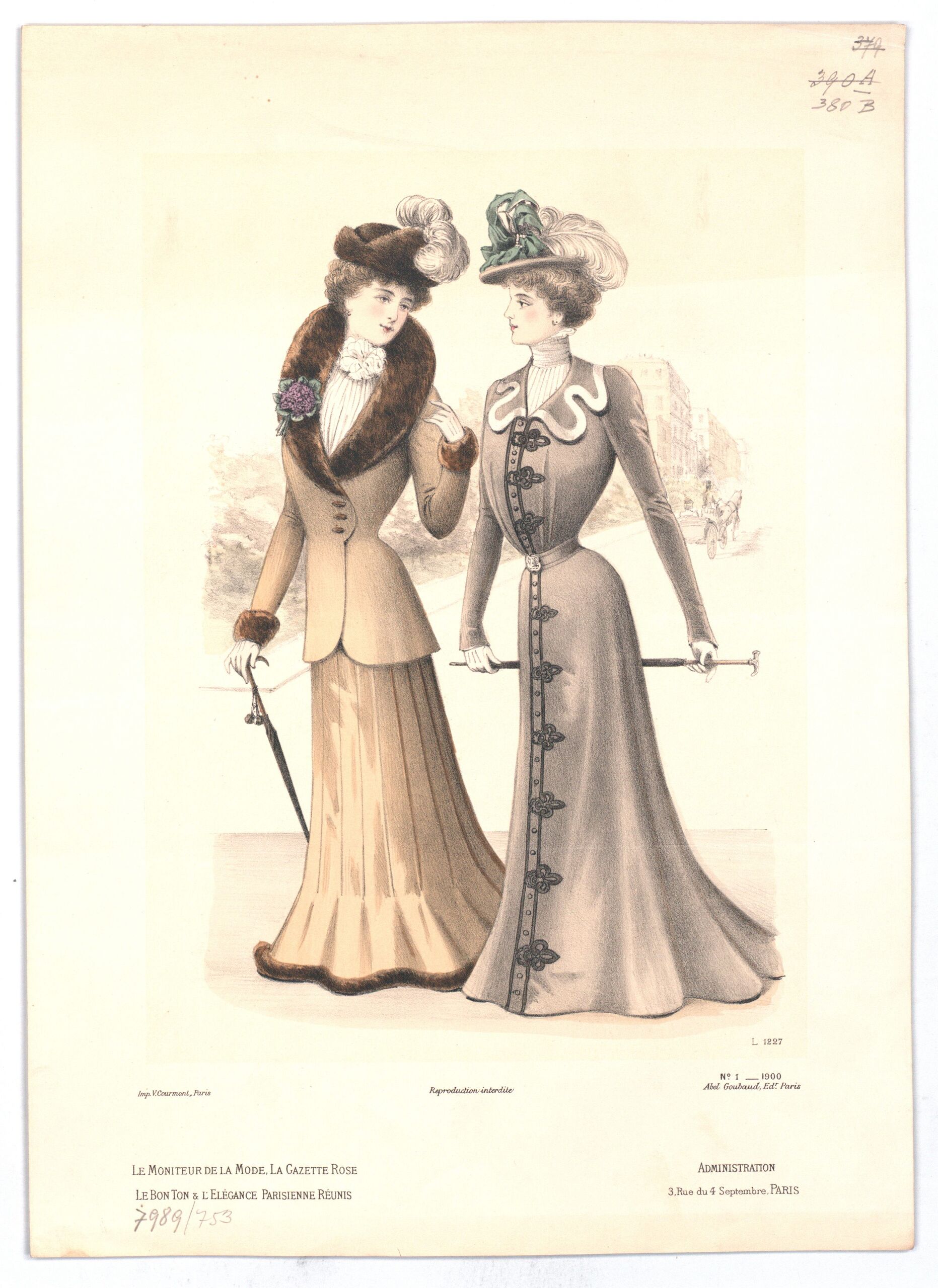 - Text am Objekt: L 1227; N° 1 1900; Imp. V. Courmont, Paris; Reproduction Interdite; Abel Goubaud Ed. Paris; Le Moniteur de la Mode, la gazette rose / le bon ton & l'elégance parisienne réunis; Administration / 3, Rue du 4 Septembre, PARIS