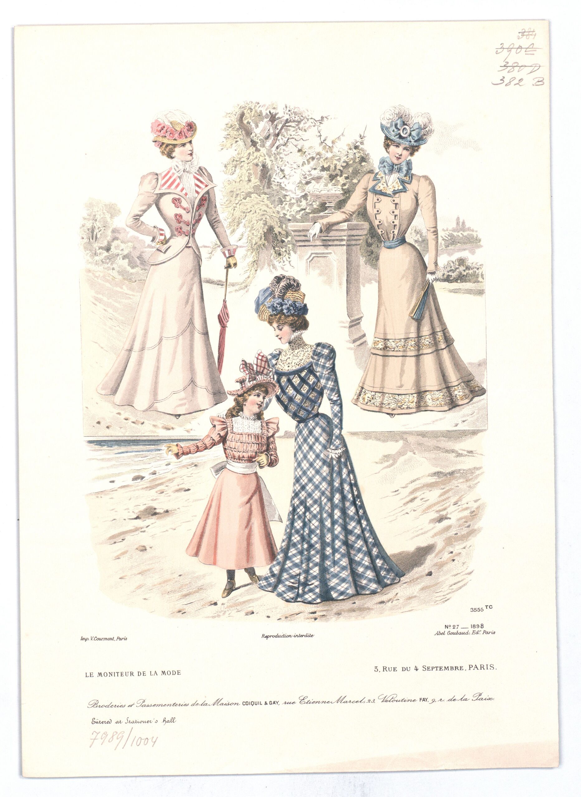 - Text am Objekt: 3555 TC; N° 27 1898; Imp. V. Courmont, Paris; Reproduction Interdite; Abel Goubaud Ed. Paris; Le Moniteur de la Mode, 3, Rue du 4 Septembre, paris / [...] / Entered at Stationer's Hall