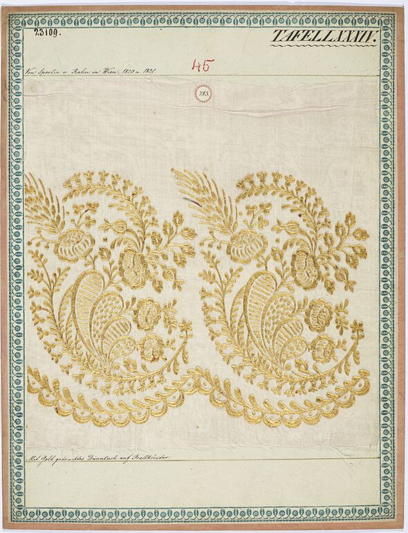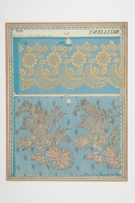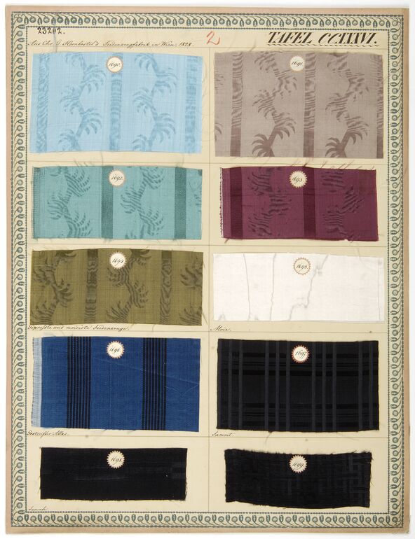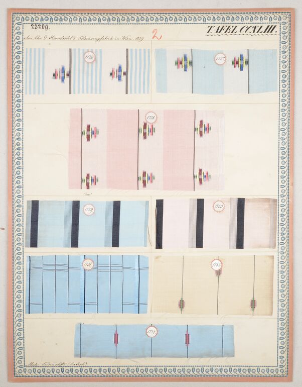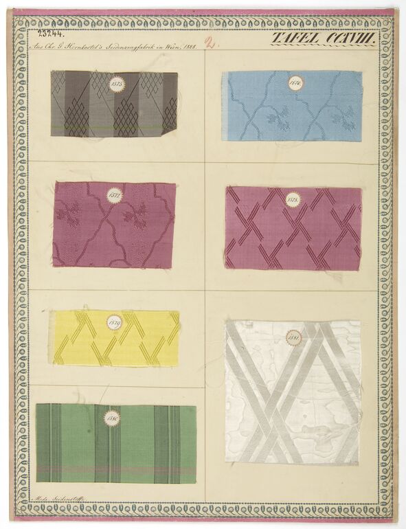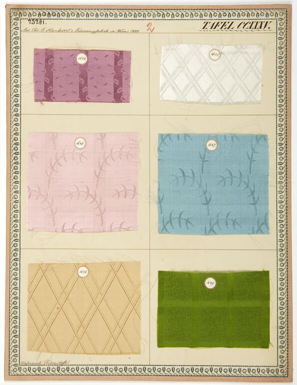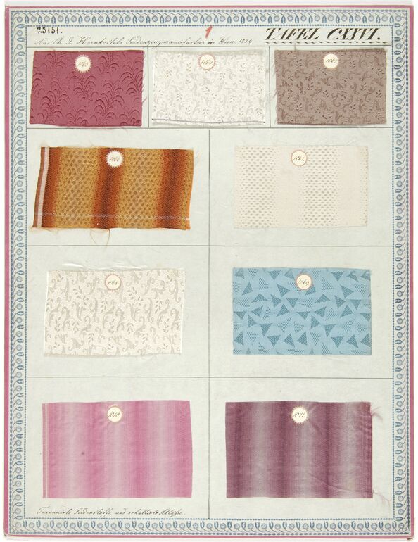 - Beschriftung (Vorderseite) : Aus der Hornbostelschen Seidenzeugfabrik in Wien, 1818 - 1819. / Möbelstoffe.