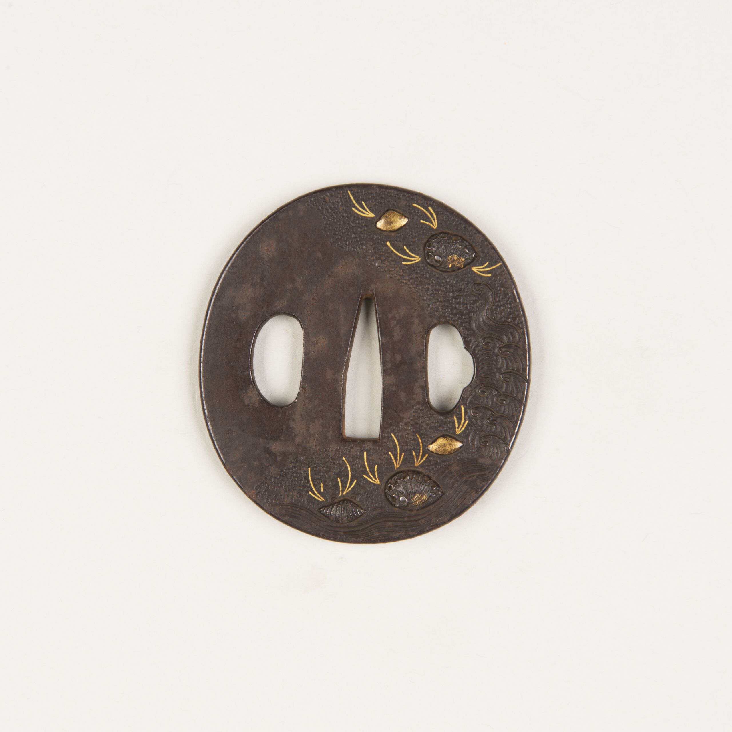 Form: länglich rund (nagamarugata 長丸形); Relief mit linearen Einlagen (zōgan 象嵌 = Tauschierung) aus Gold; zu beiden Seiten der länglichen Öffnung in der Mitte (nakagoana 中心穴 oder茎穴) befinden sich die Öffnungen kozukahitsu 小柄櫃 links und kōgaihitsu 笄櫃 rechts.