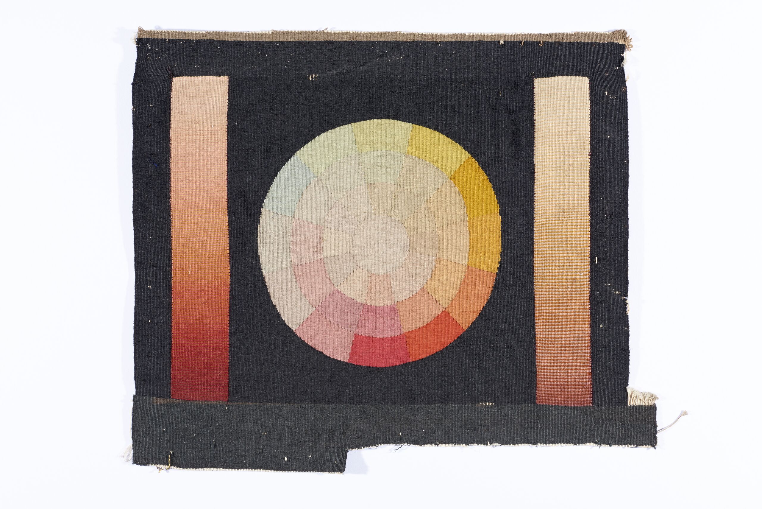 Tapisseriemuster, Musterstück mit Farbenkreis und zwei Balken mit Farbverlauf auf schwarzem Grund, Ecole de la manufacture des Gobelins et des Tapis à Paris, MAK Inv.nr. T 2293-7