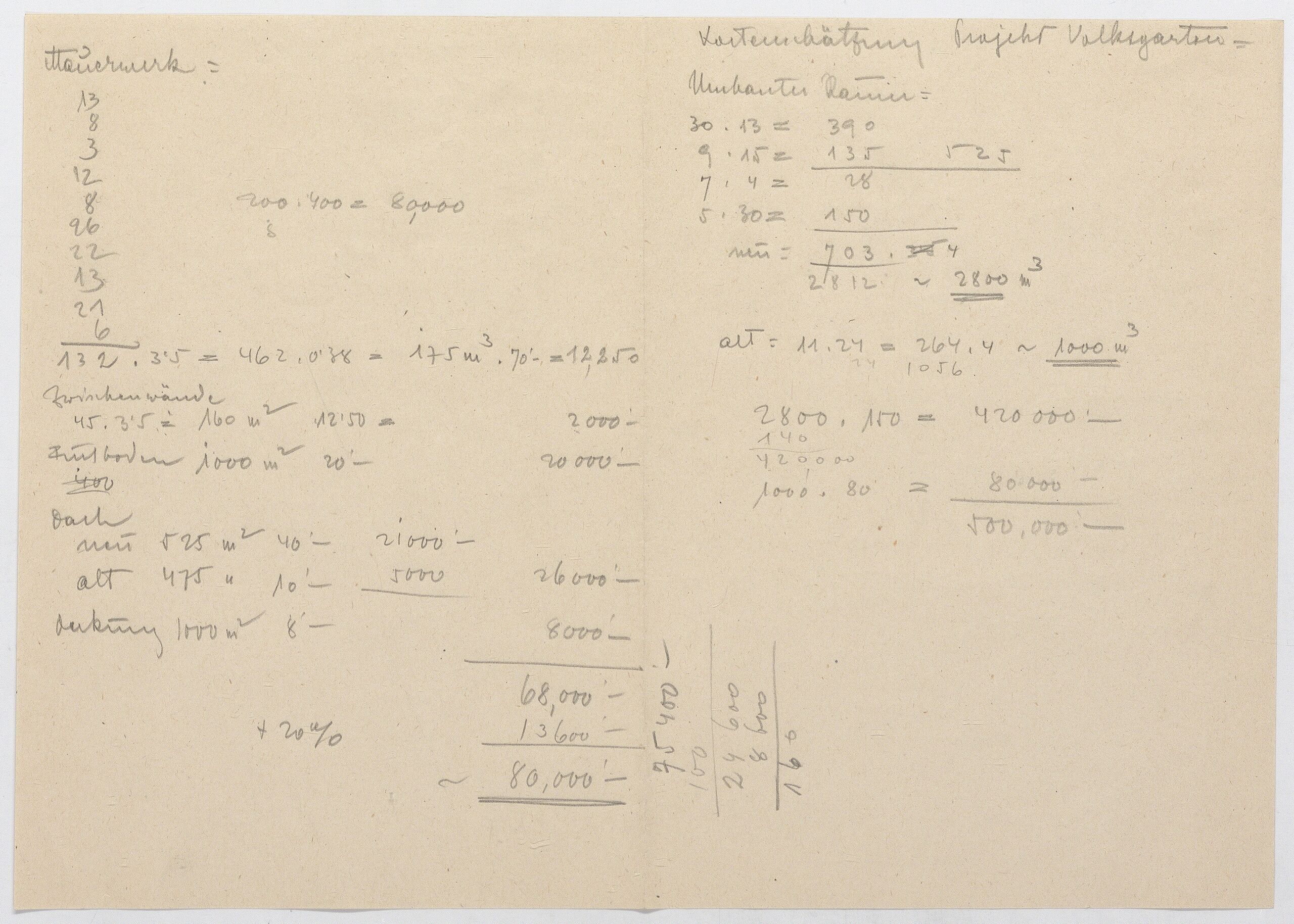 Notiz, Notiz mit Kostenberechnungen für das Kaffeehaus, Anna-Lülja Praun, MAK Inv.nr. KI 16475-4-797