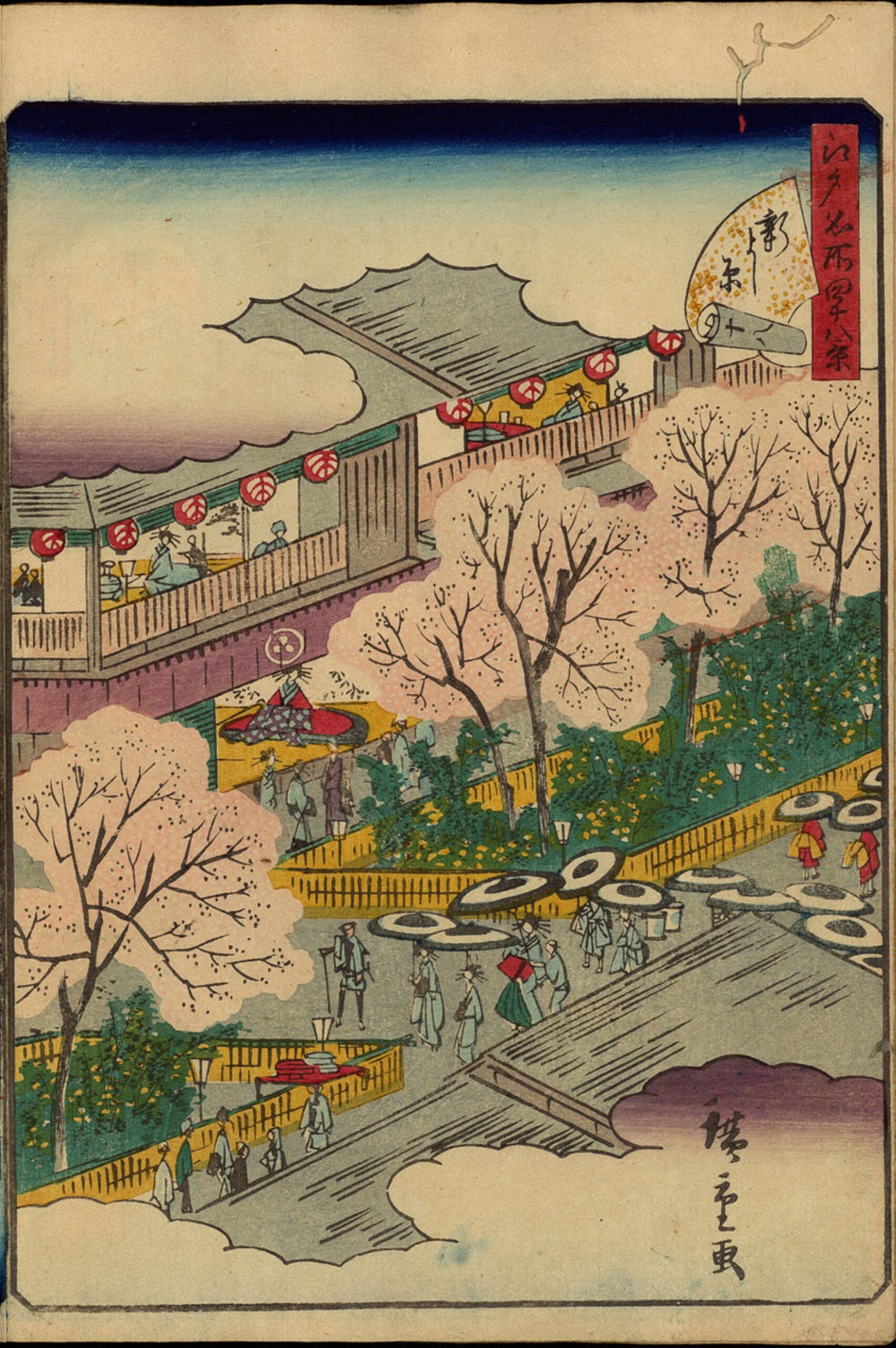 Hiroshigega 廣重画 Serie von Hiroshige II. mit 48 Ansichten von Edo, die in der Auswahl der Orte große Ähnlichkeit mit den 100 Ansichten von Edo (Meisho Edo hyakkei 名所江戸百景) von Hiroshige I. aufweist. Das Freudenviertel Yoshiwara 吉原 (im Titel: よし原) mit seiner mit Kirschbäumen (sakura) gesäumten Hauptstraße (Nakanochō). Unter Schirmen promenieren hochrangige Kurtisanen durch die Straßen.
